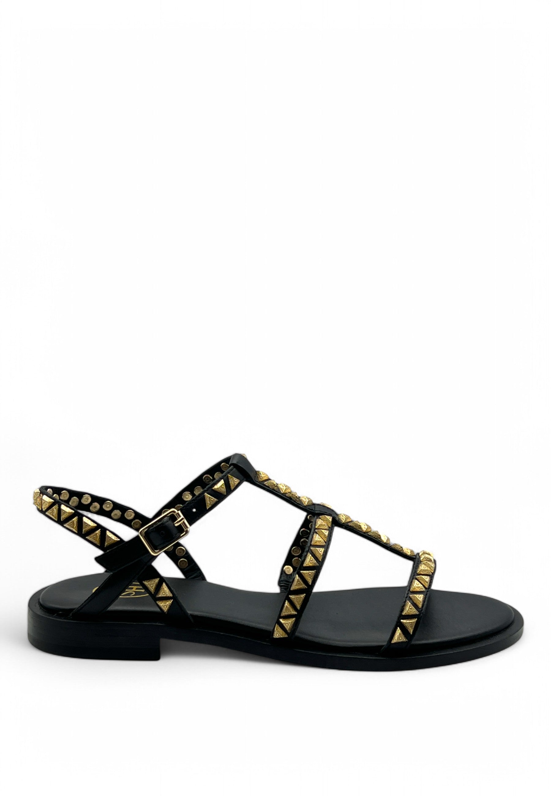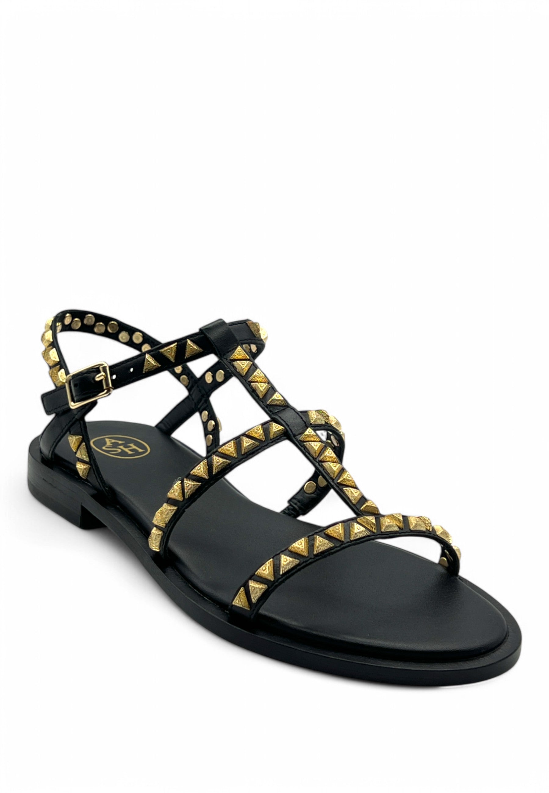 • SANDALO ACCOLLATO, ALLACCIATURA ALLA CAVIGLIA, BORCHIE ORO DECORATIVE