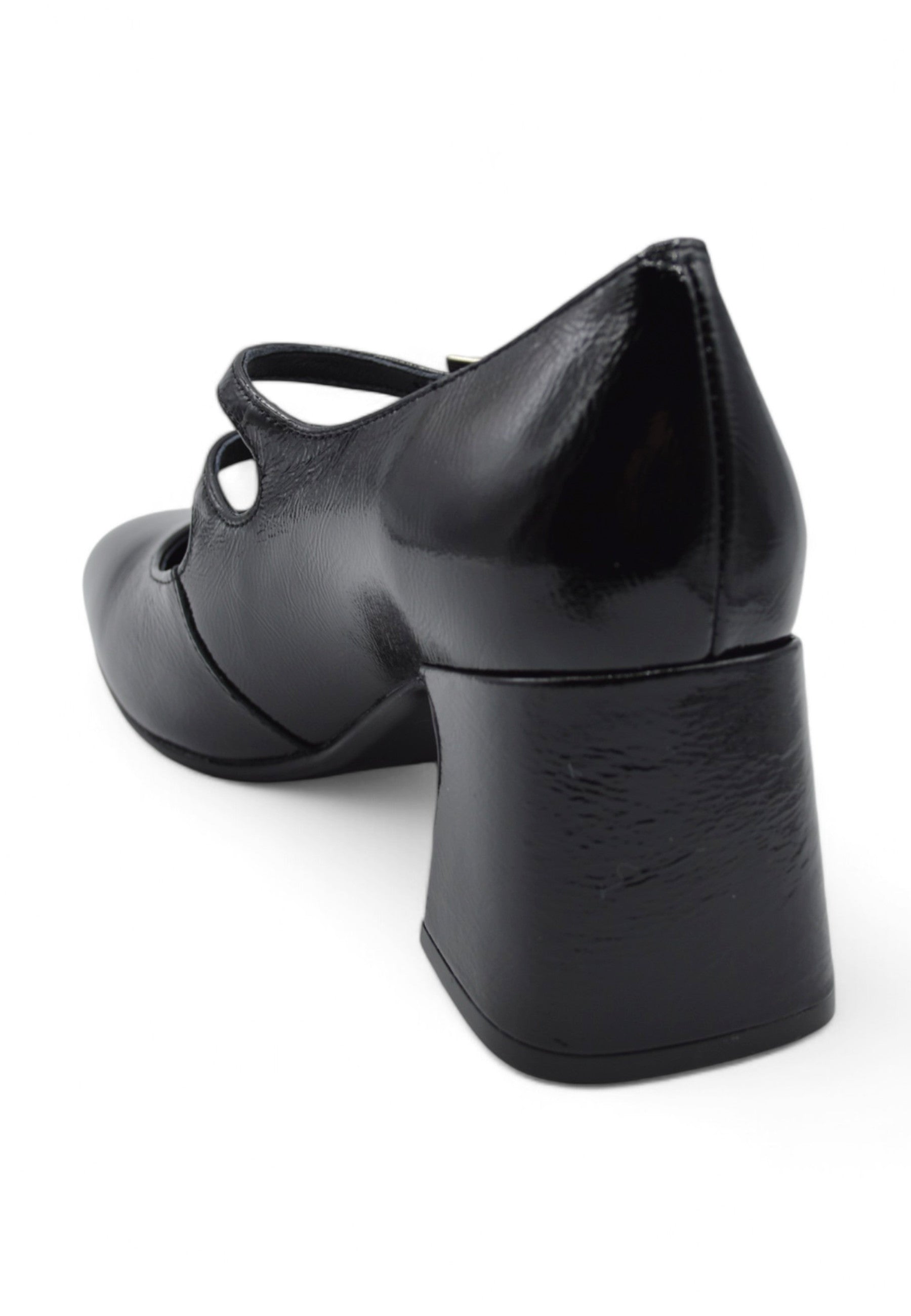 • BALLERINA CON TACCO, EFFETTO VERNICE, DOPPIA FIBBIETTA, PUNTA TONDA, TACCO LARGO