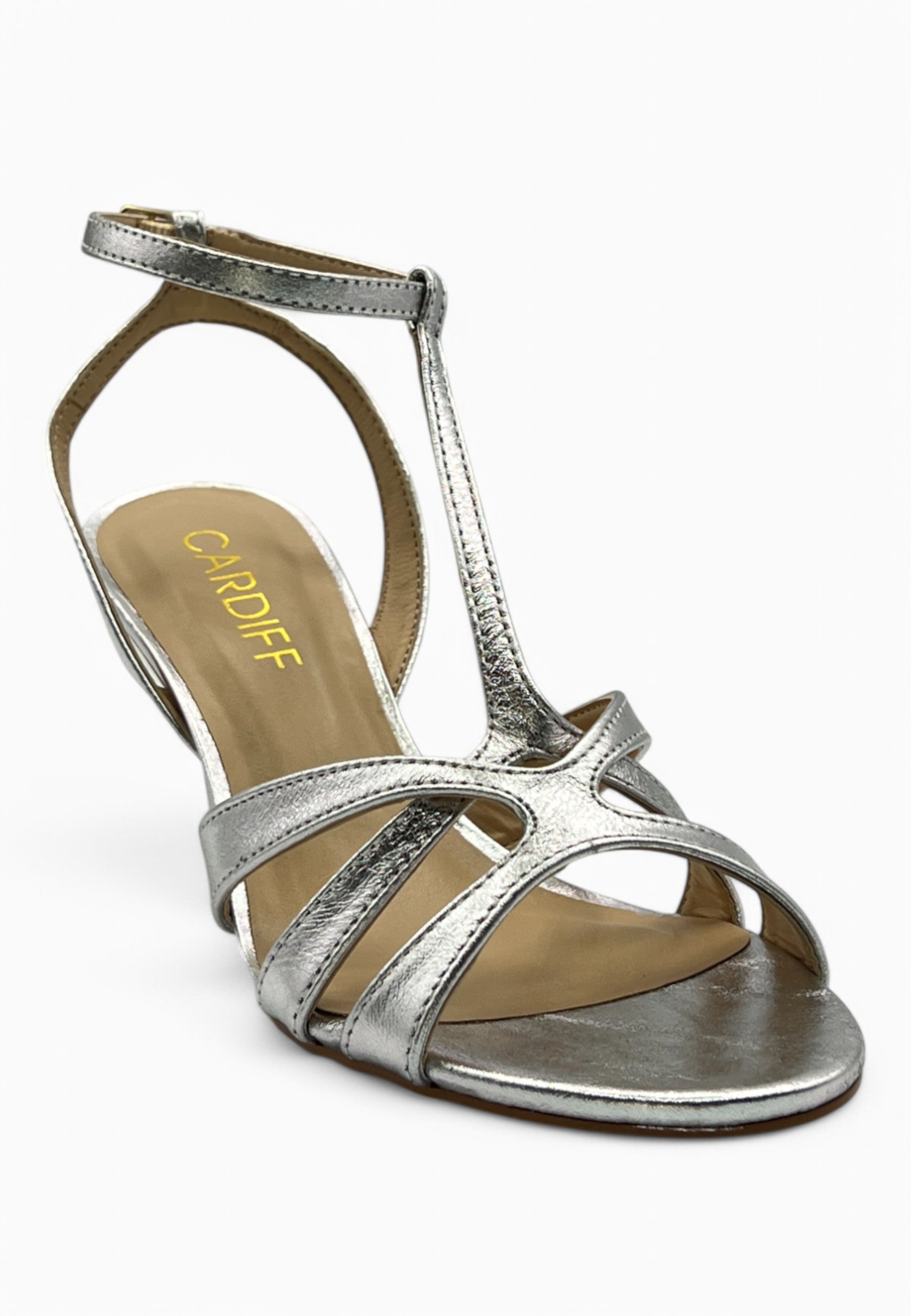 • SANDALO CON TACCO, VERA PELLE, COLORE ORO LAMINATO, ALLACCIATURA ALLA CAVIGLIA, LISTINI A INTRECCIO