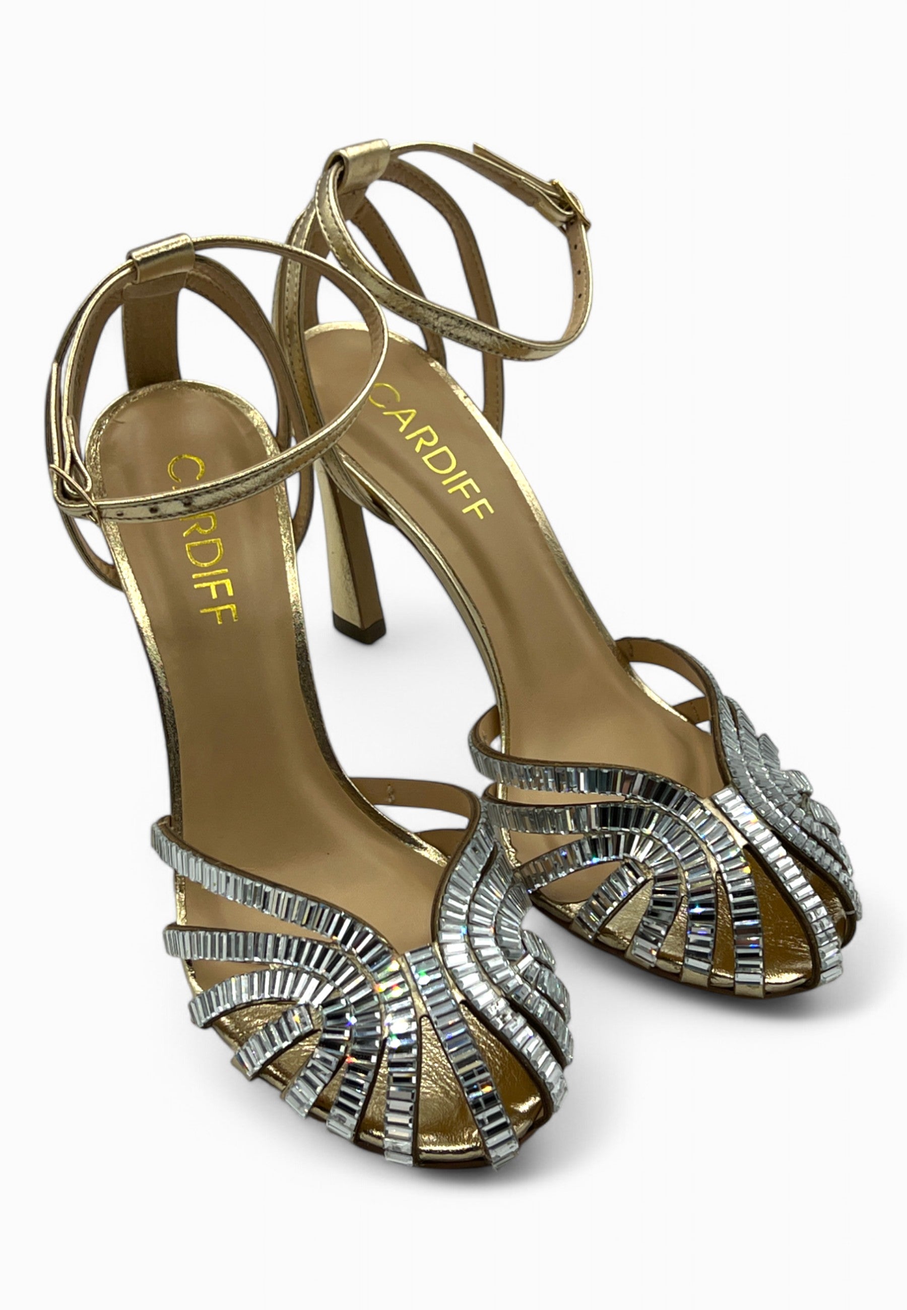• SANDALO CON TACCO, VERA PELLE, LISTINI A INTRECCIO, ALLACCIATURA ALLA CAVIGLIA, DETTAGLI GIOIELLO APPLICATI