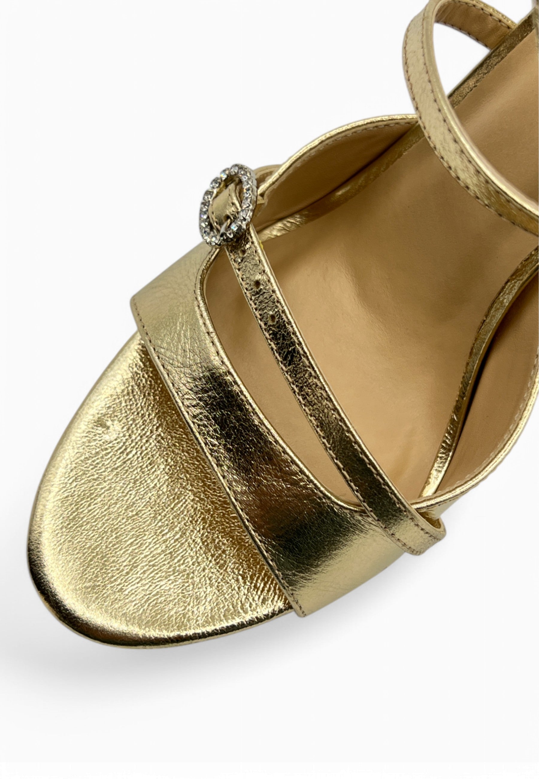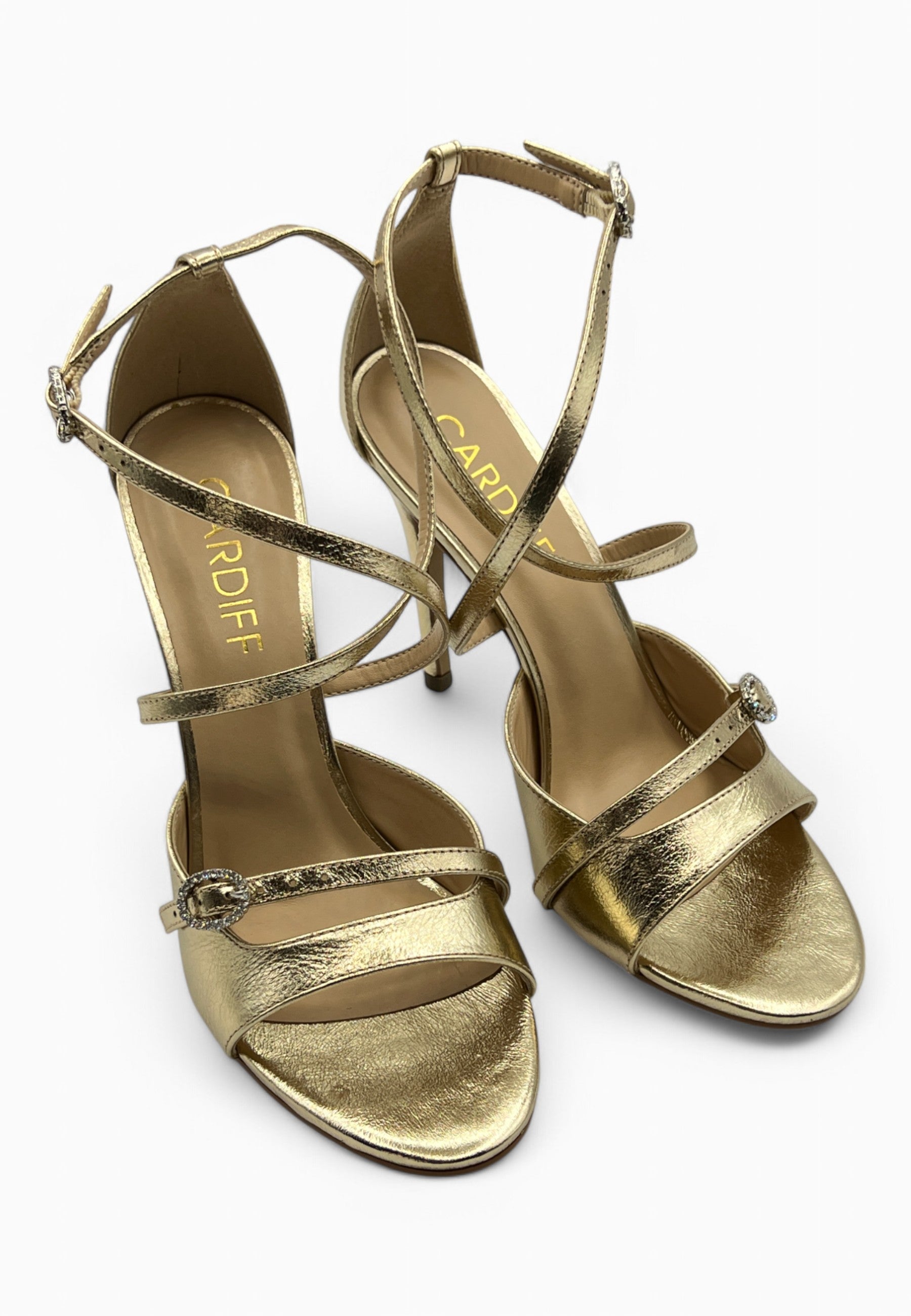 • SANDALO CON TACCO, VERA PELLE, LISTINI A INTRECCIO, ALLACCIATURA ALLA CAVIGLIA, FIBBIETTA GIOIELLO