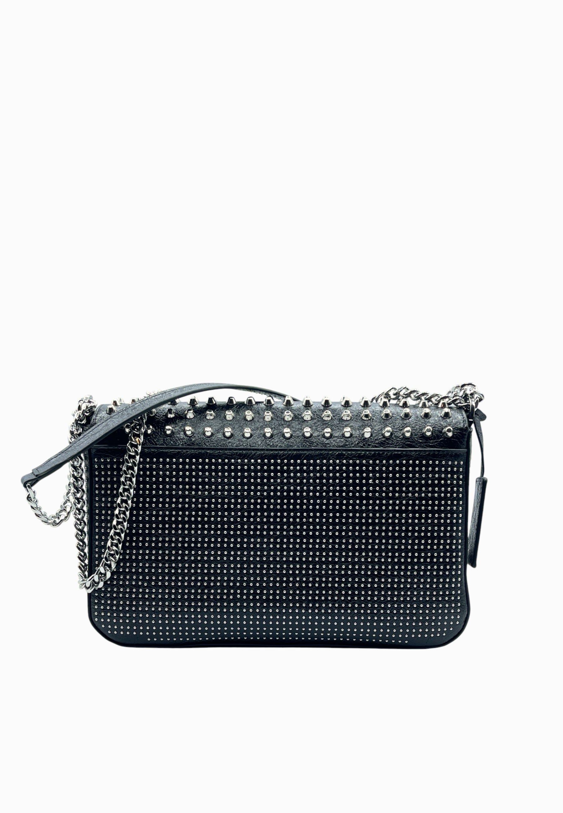 • BORSA FULL BORCHIE E MICRO BORCHIE CON TRACOLLA A CATENA E LOGO ANTERIORE COLOR ARGENTO
