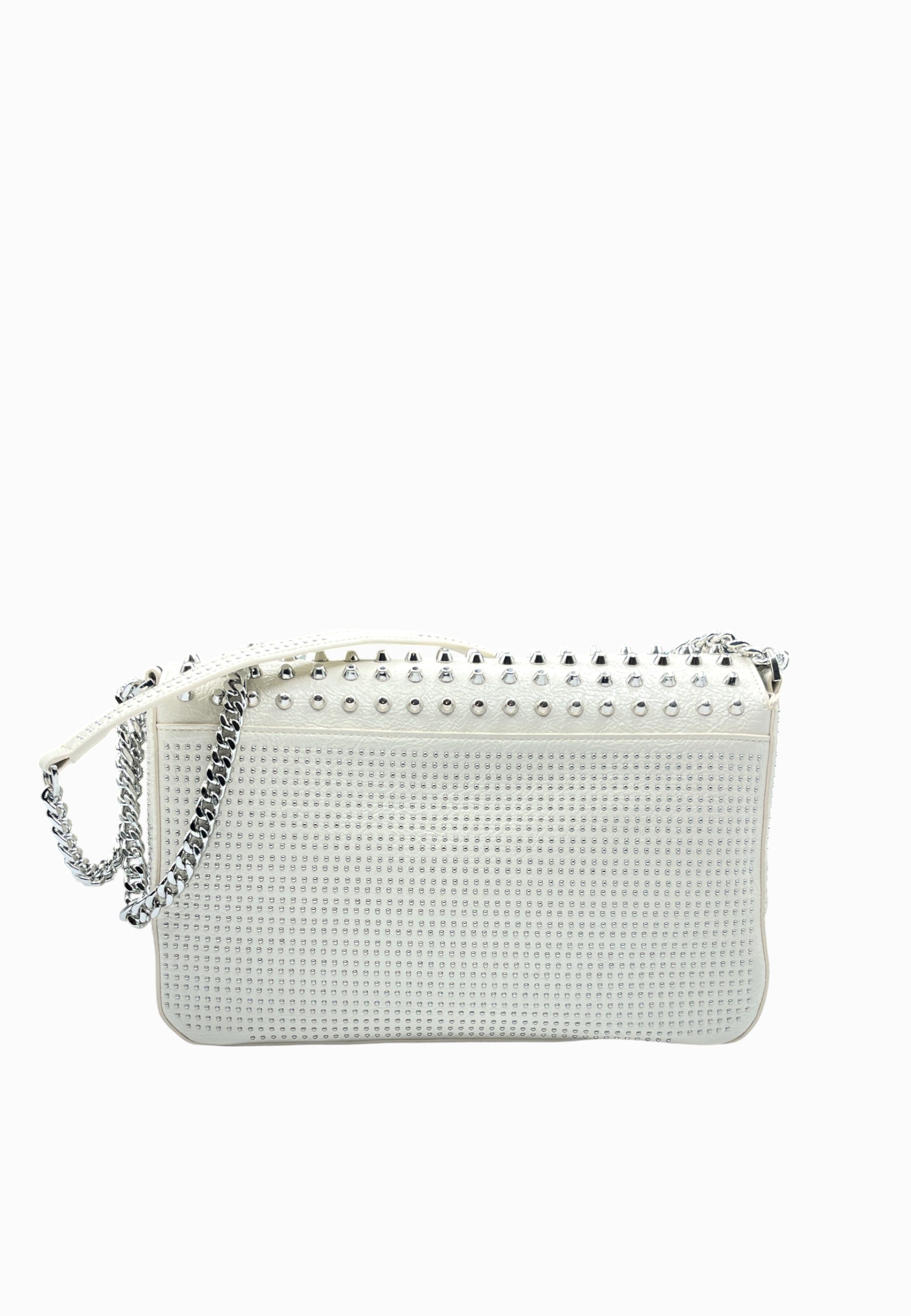 • BORSA FULL BORCHIE E MICRO BORCHIE CON TRACOLLA A CATENA E LOGO ANTERIORE COLOR ARGENTO