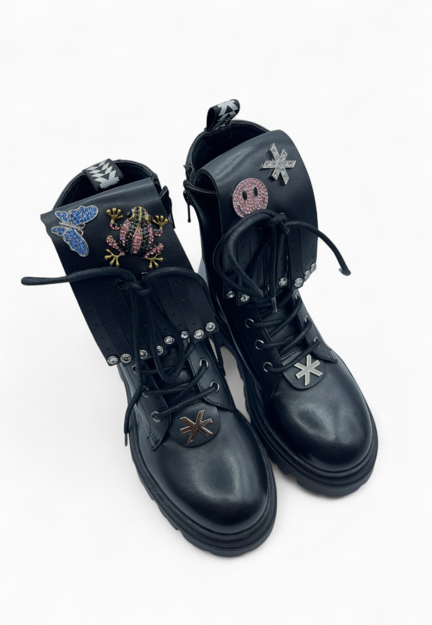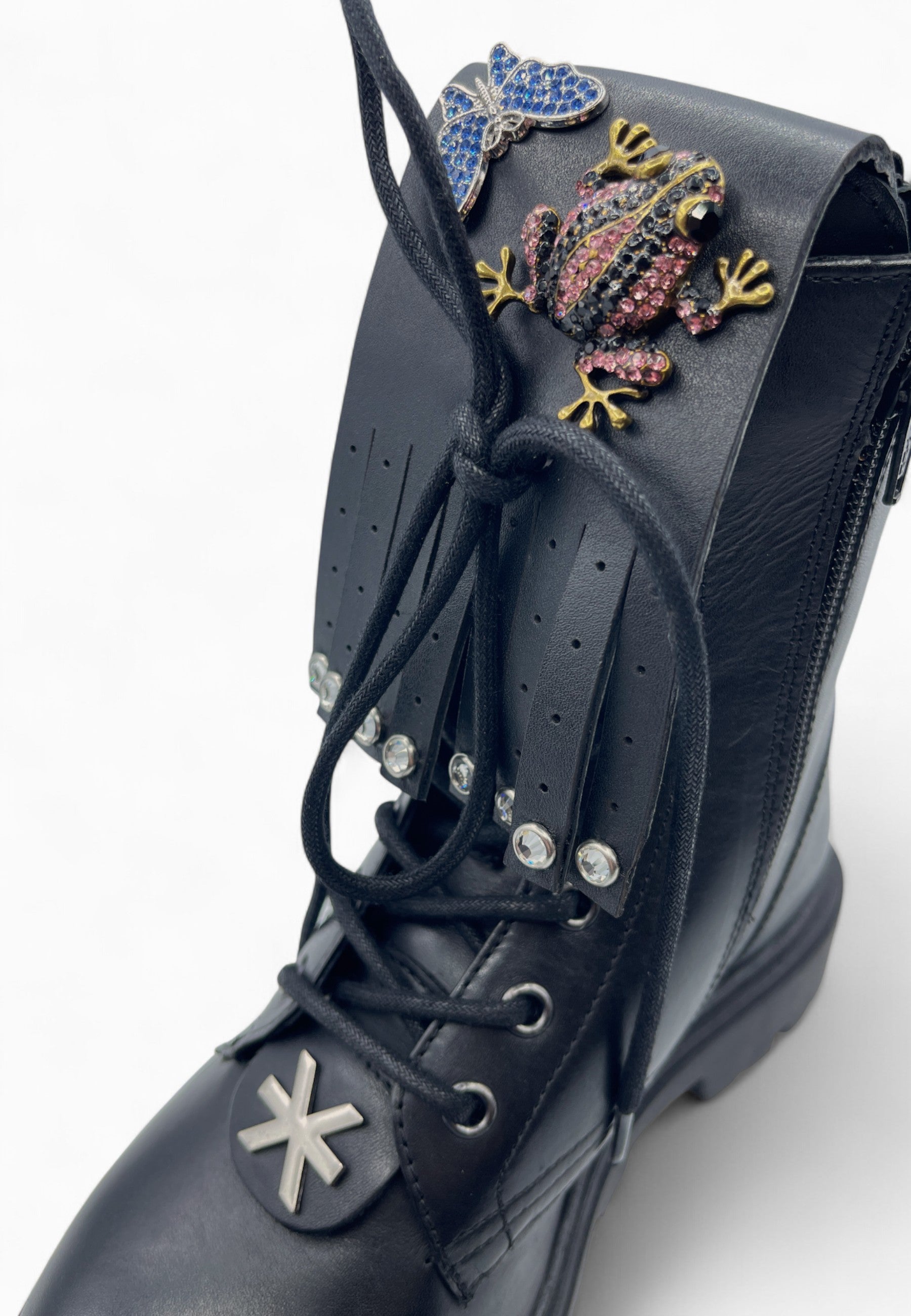 • ANFIBIO STRINGATO CON SUOLA CARRARMATO ,CERNIERA LATERALE ,DECORAZIONI FULL STRASS E MICRO BORCHIE SULLA FRANGIA REMOVIBILE