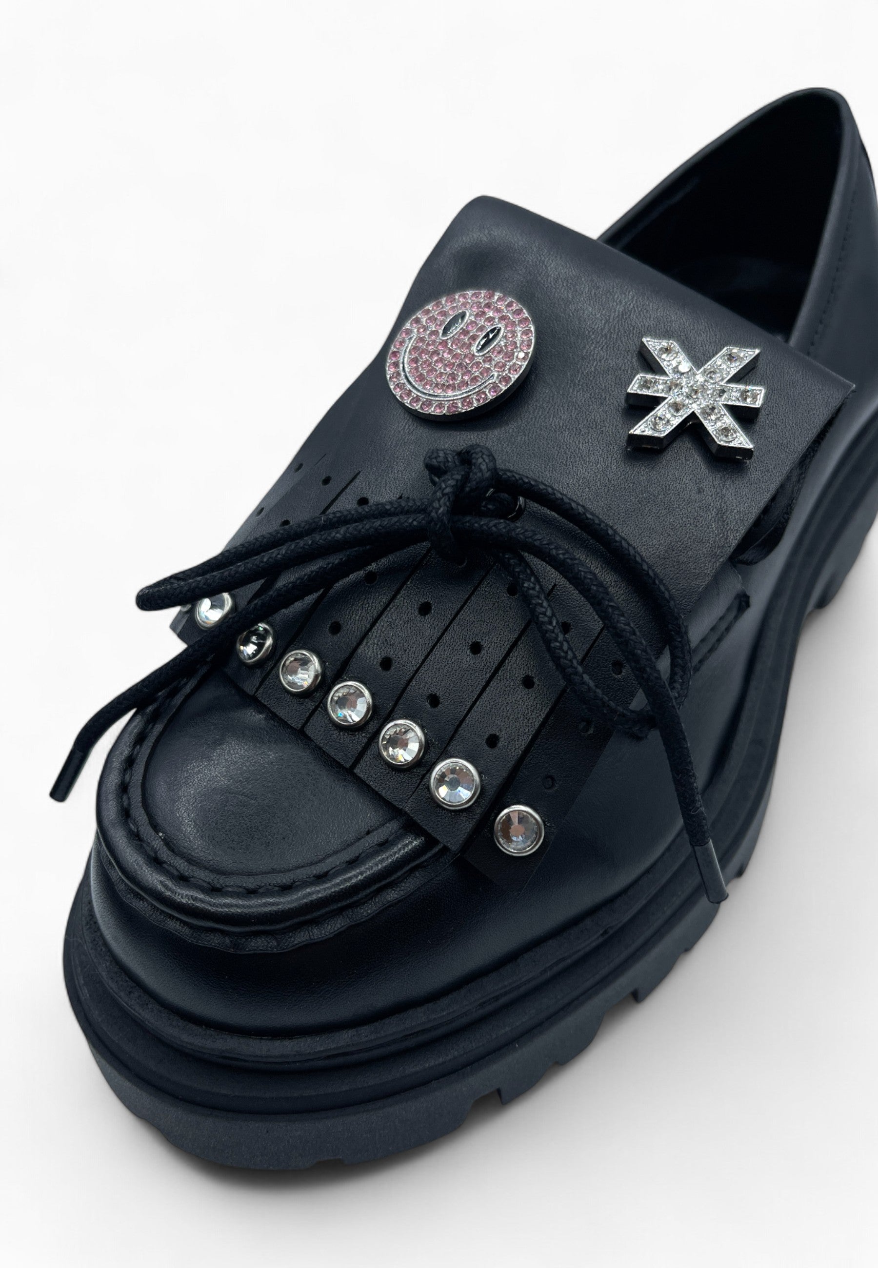 • MOCASSINO CON SUOLA CARRARMATO,FRANGE REMOVIBILI ARRICCHITE DA MICRO BORCHIE E SPILLE FULL STRASS