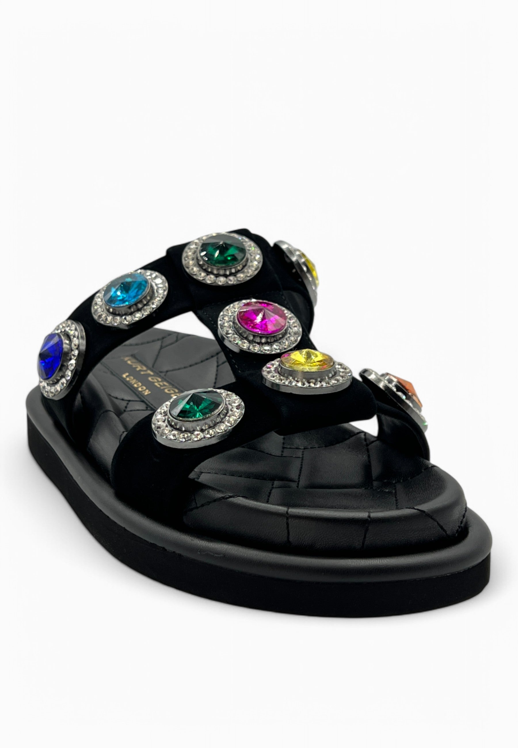 • CIABATTA, TOMAIA IN PELLE SCAMOSCIATA, SUOLA IN GOMMA, DETTAGLI GIOIELLO COLORATI APPLICATI