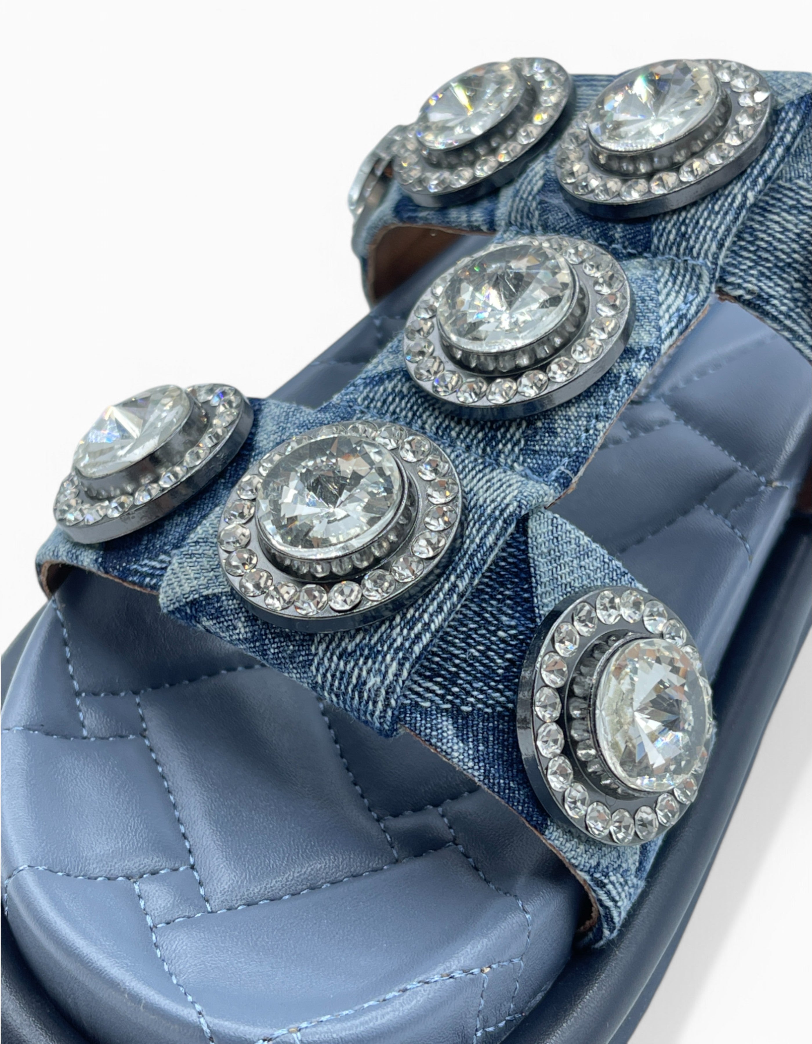 • CIABATTA DENIM, LISTINI IN TESSUTO, DETTAGLI GIOIELLO APPLICATI