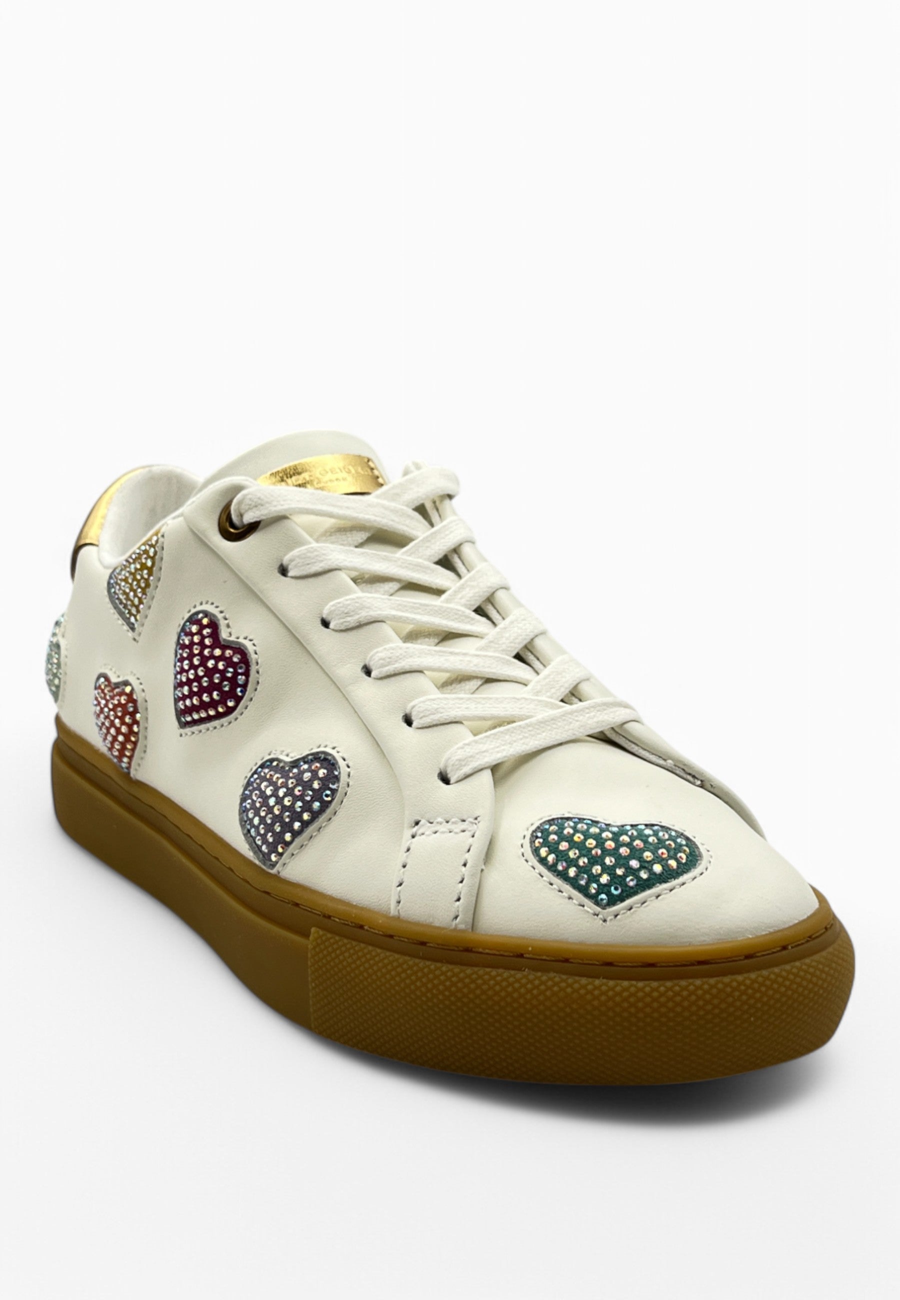 • SNEAKER, TOMAIA IN PELLE, SUOLA IN GOMMA NATURALE, FANTASIA CUORI CON STRASS, LOGO ICONICO SU LINGUETTA, TALLONE LOGATO LAMINATO ORO