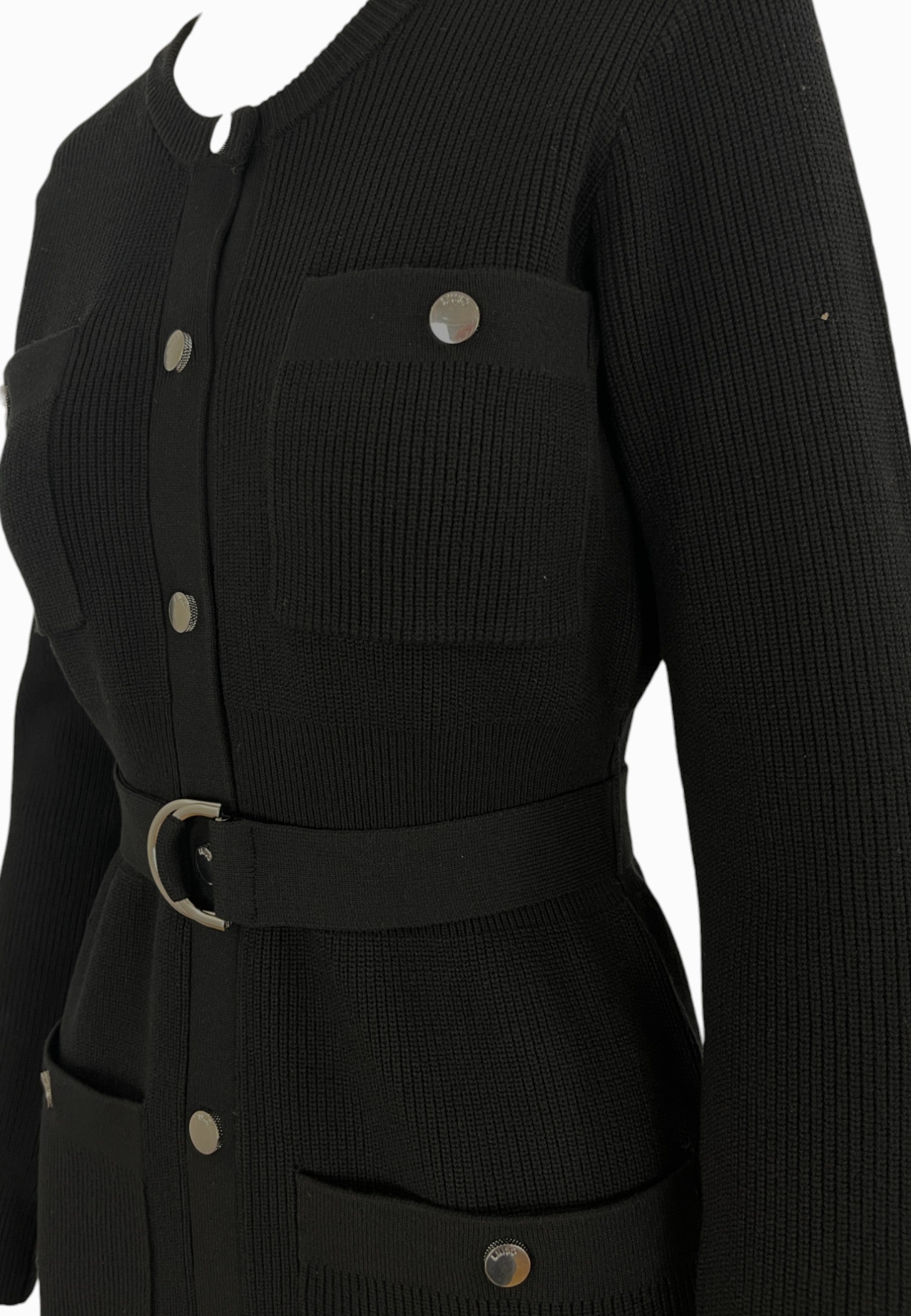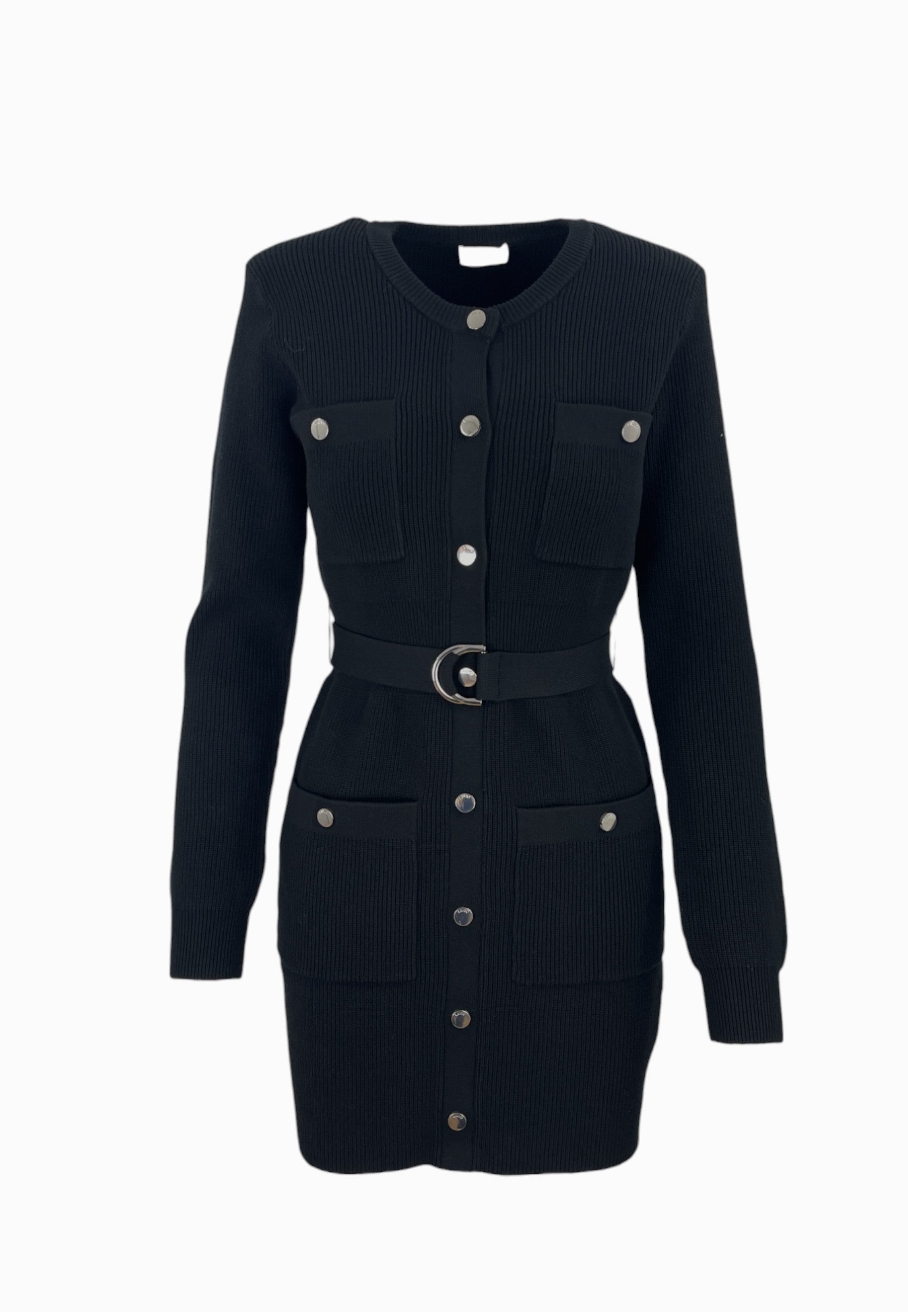 • ABITO A COSTINE MODELLO CHEMISIER, GIROCOLLO CON BORDO IN CONTRASTO,BOTTONI COLORE ARGENTO,SPALLE IMBOTTITE,COMPRESO DI CINTURA