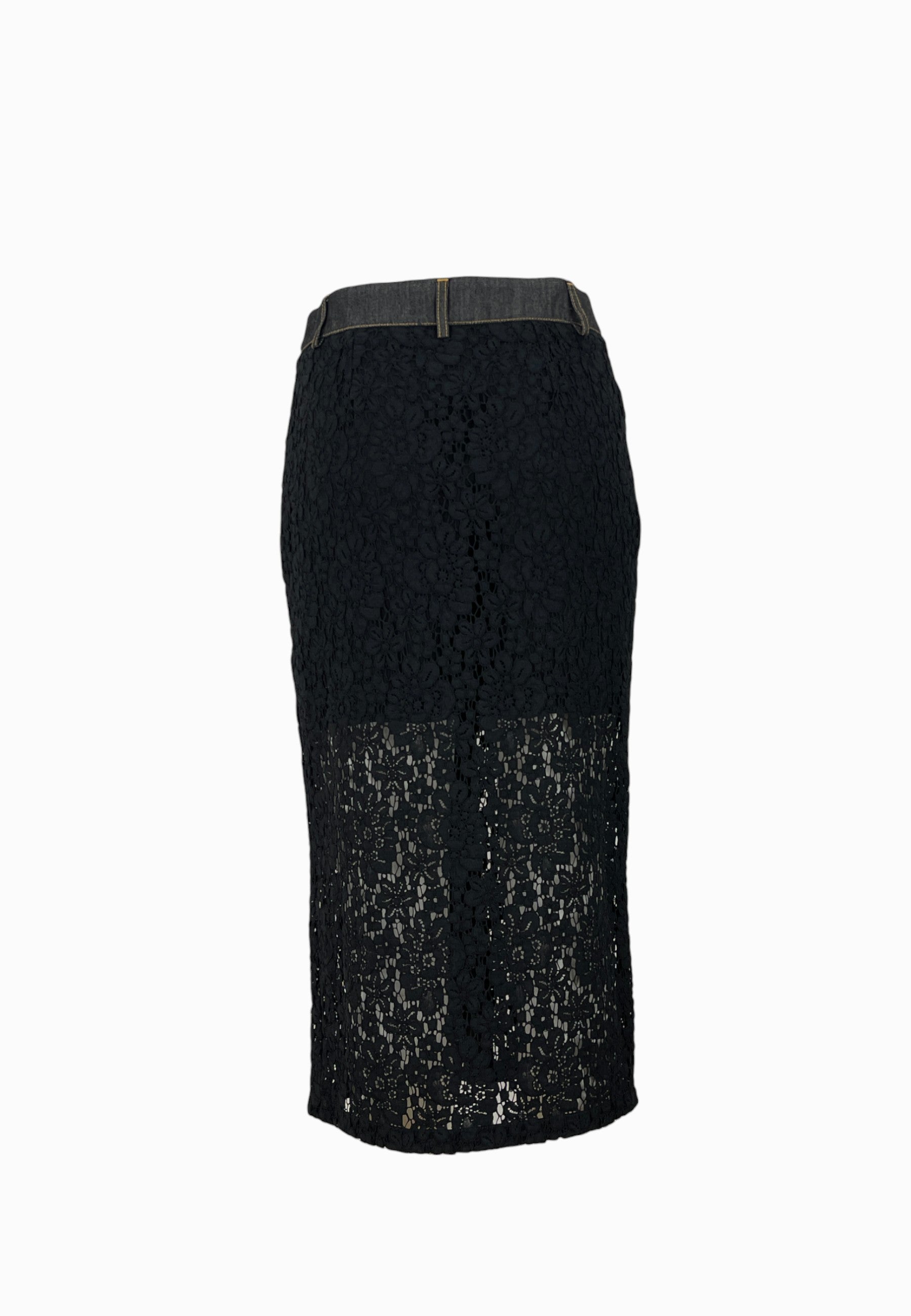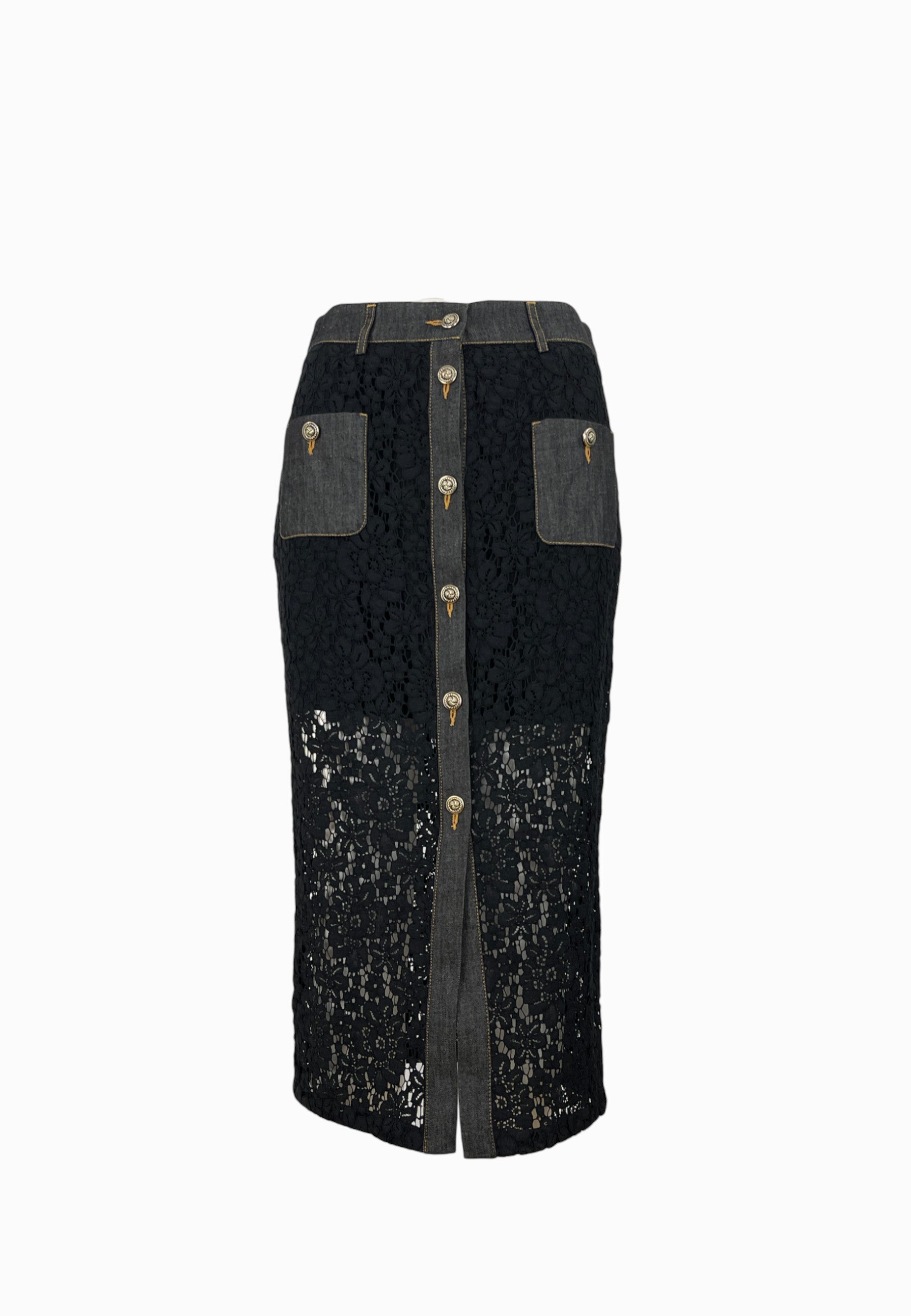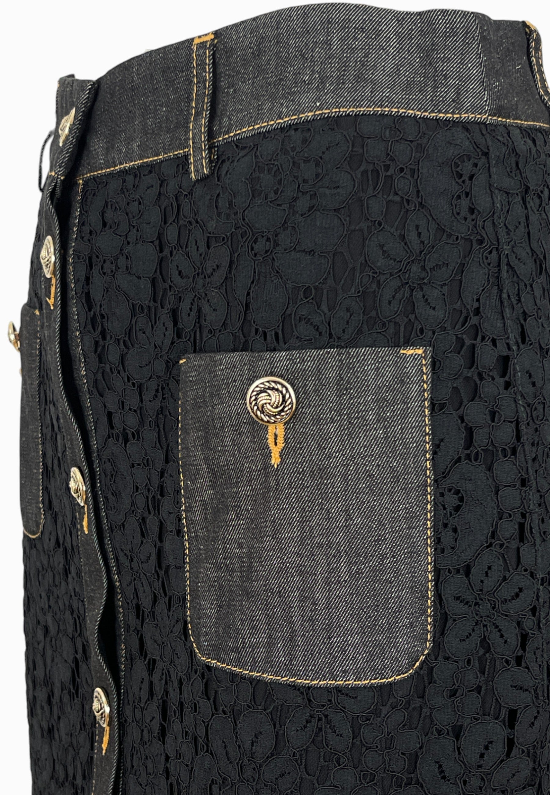 • GONNA TUBINO IN JEANS E PIZZO ELASTICIZZATO,DUE TASCHE,BOTTONI COLORE ARGENTO