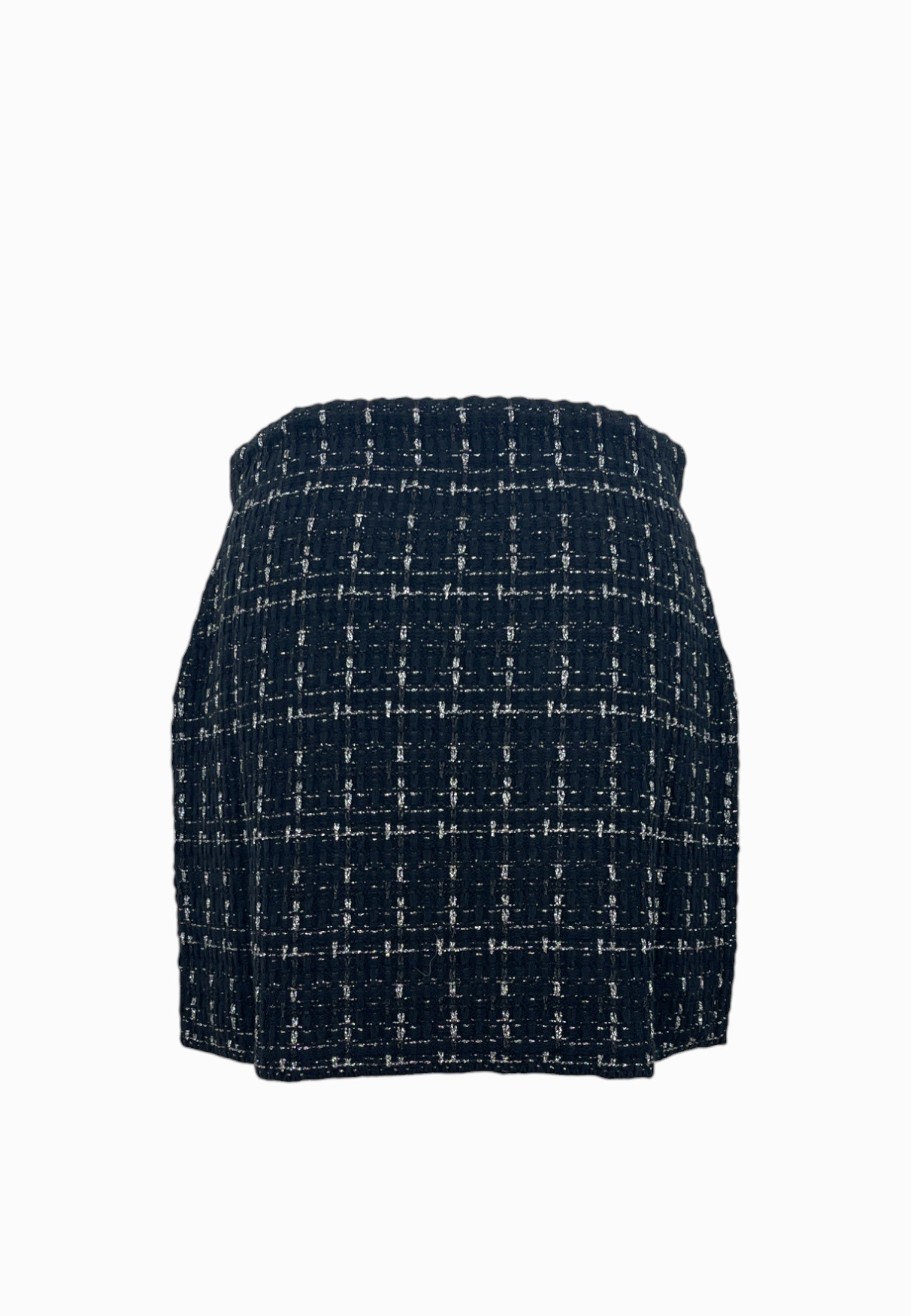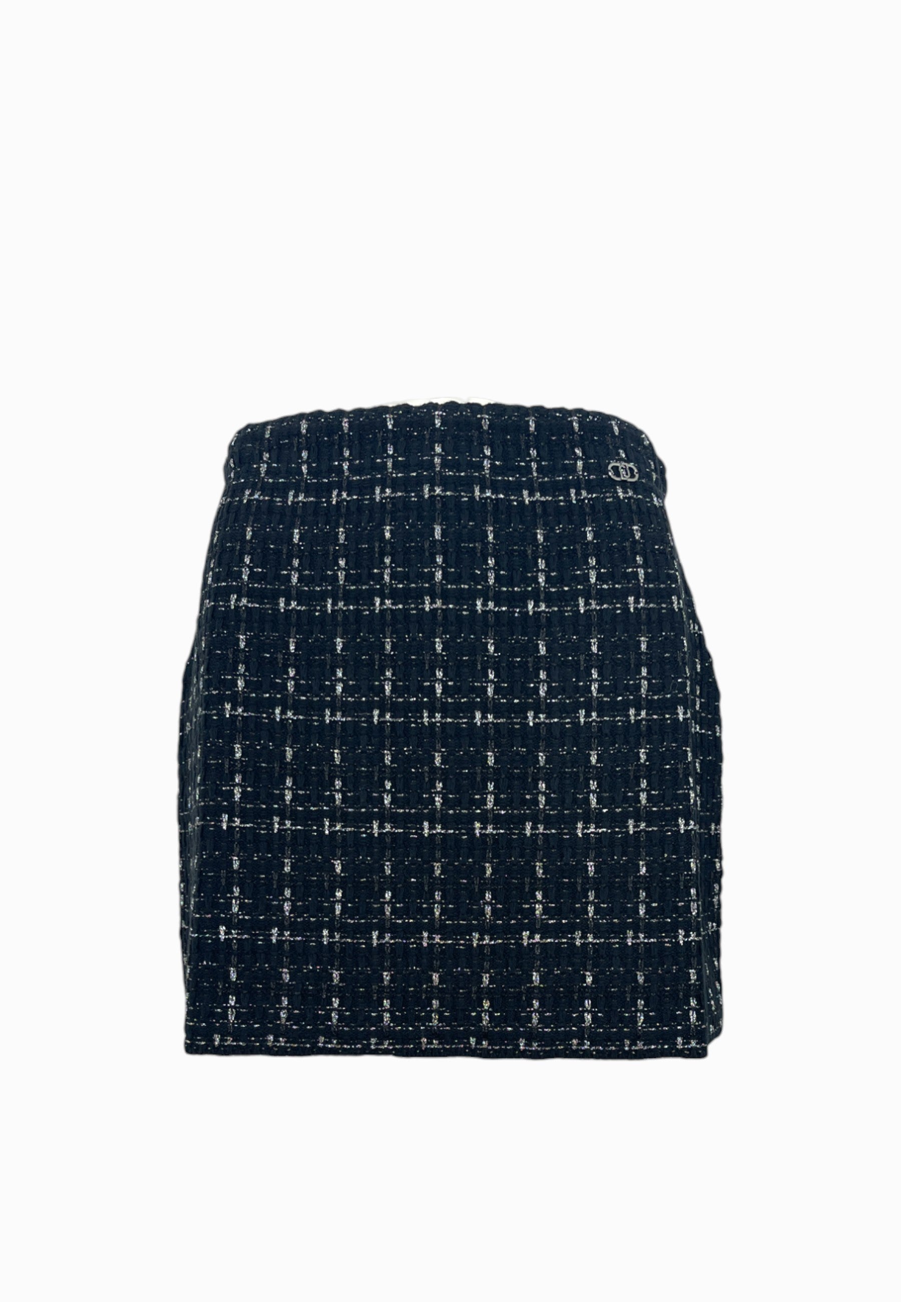 • GONNA IN MAGLIA CORTA, SENZA CERNIERA CON ELASTICO IN VITA,DI BASE NERA CON FILO METALLICO COLORE ARGENTO
