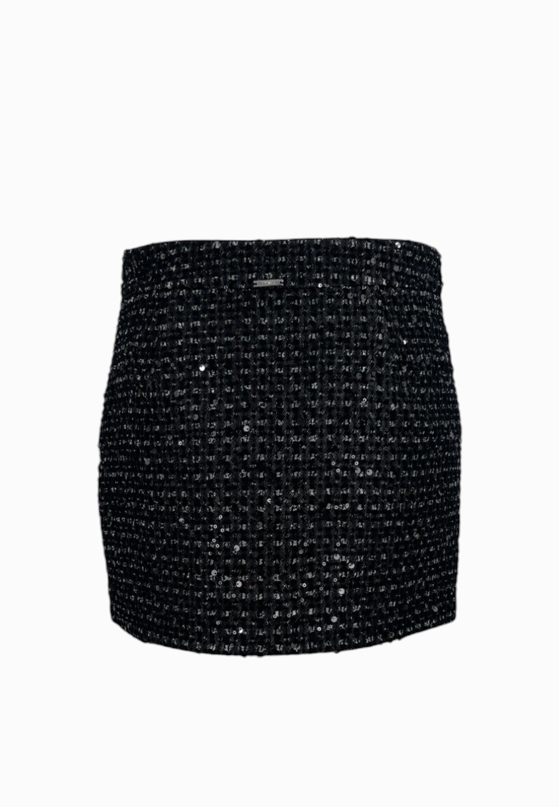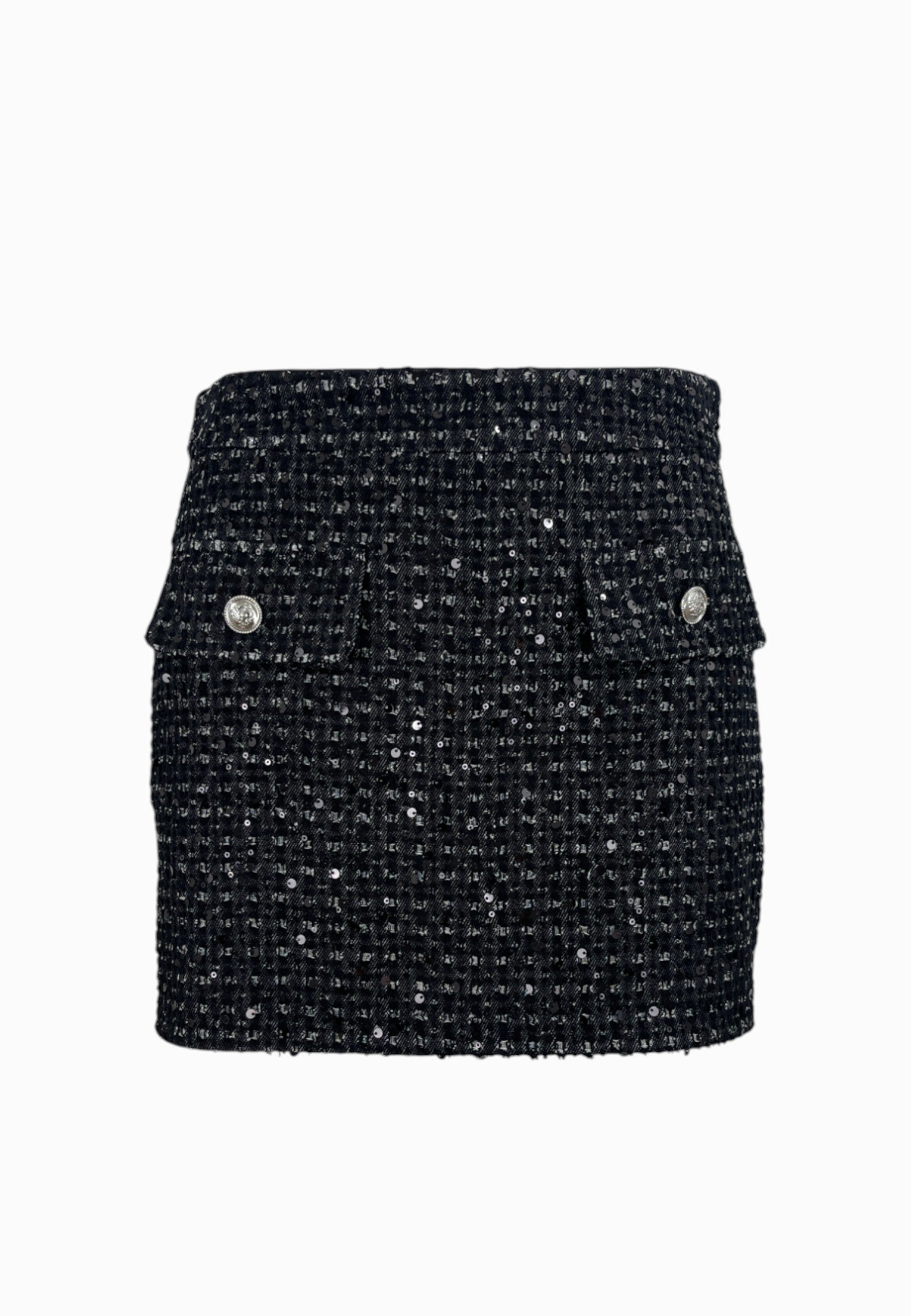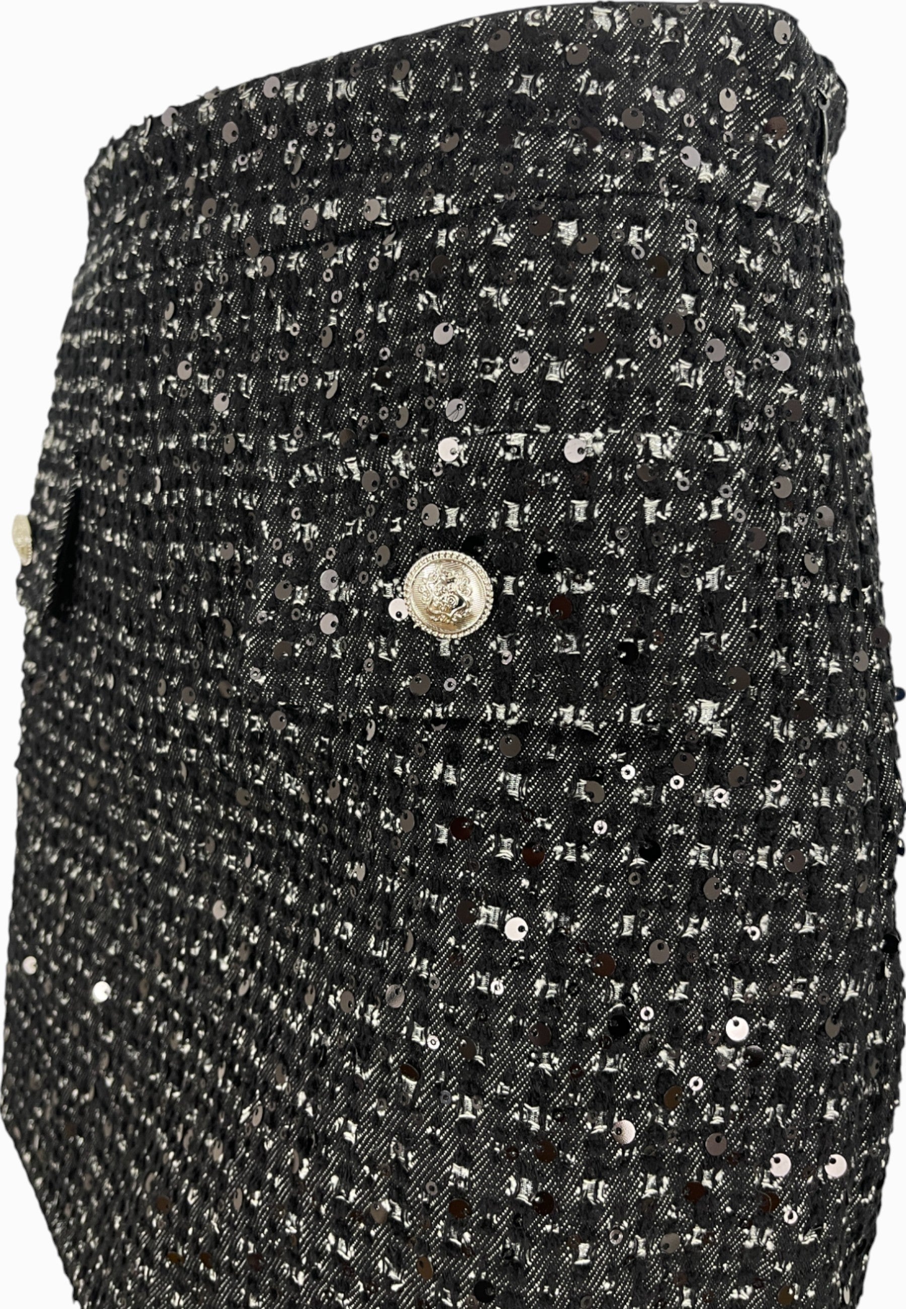 • MINIGONNA CON MICRO LAVORAZIONE ARRICCHITA DA PAILLETTES NERE,DUE BOTTONI FRONTALI COLORE ARGENTO