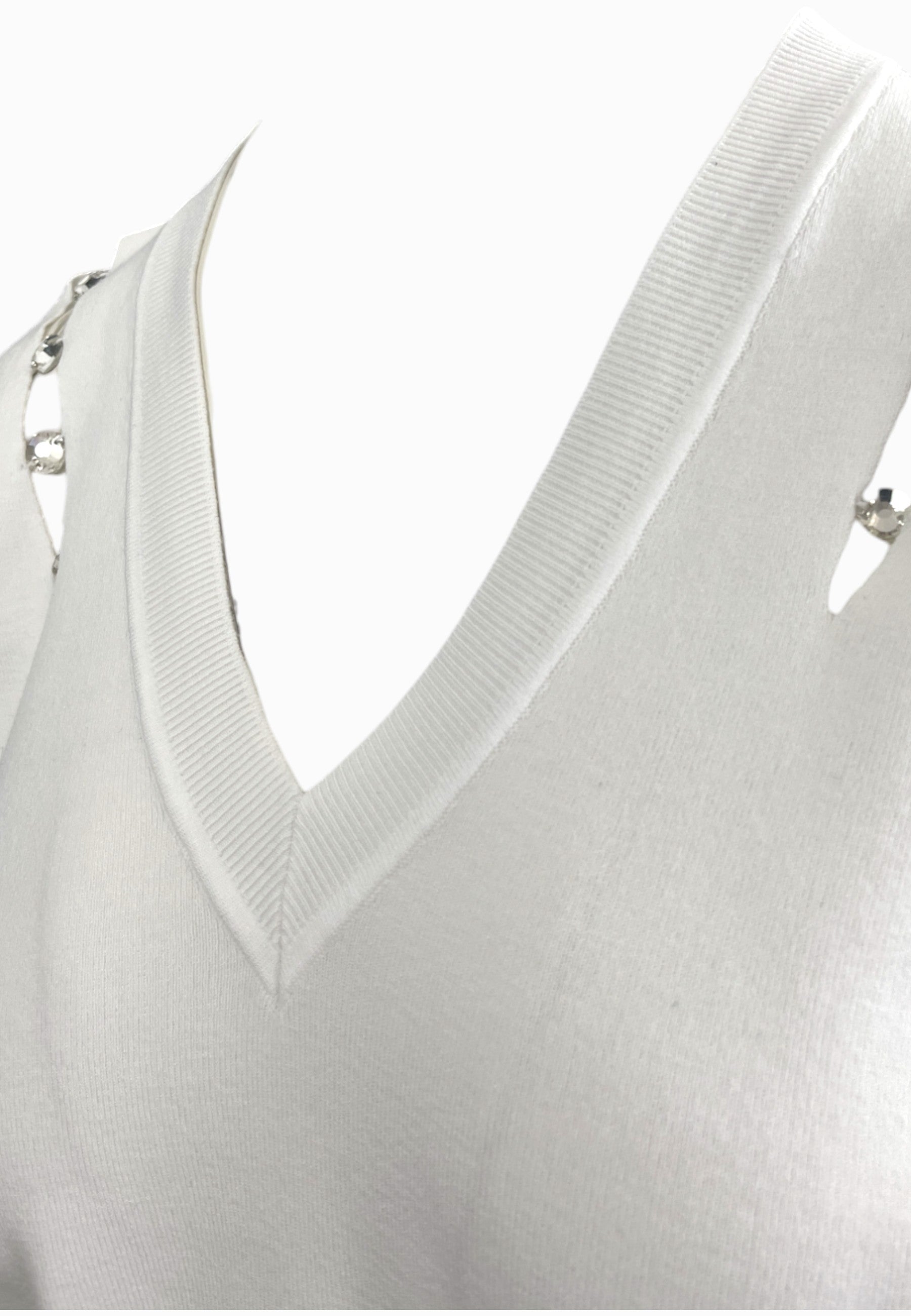 • MAGLIA MANICA LUNGA,SCOLLO A V, CON DUE FORI ALL' ALTEZZA DELLE SPALLE ARRICCHITI DA APPLICAZIONI LUMINOSE COLORE ARGENTO
