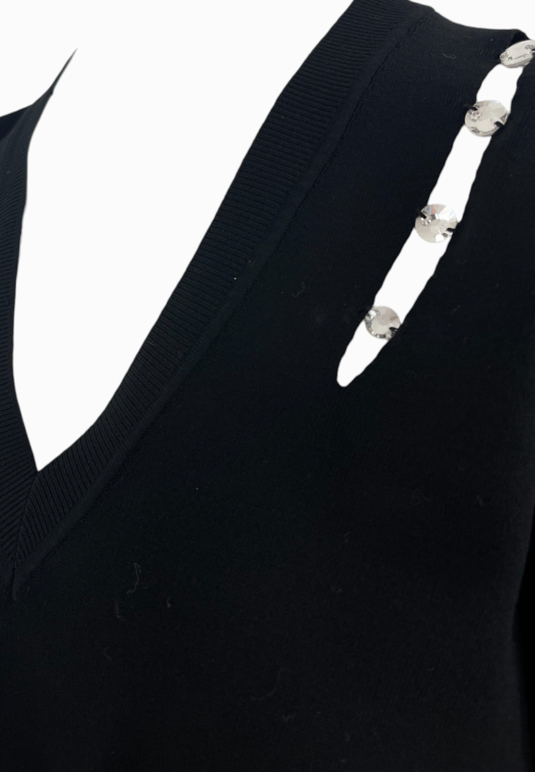 • MAGLIA MANICA LUNGA,SCOLLO A V, CON DUE FORI ALL' ALTEZZA DELLE SPALLE ARRICCHITI DA APPLICAZIONI LUMINOSE COLORE ARGENTO