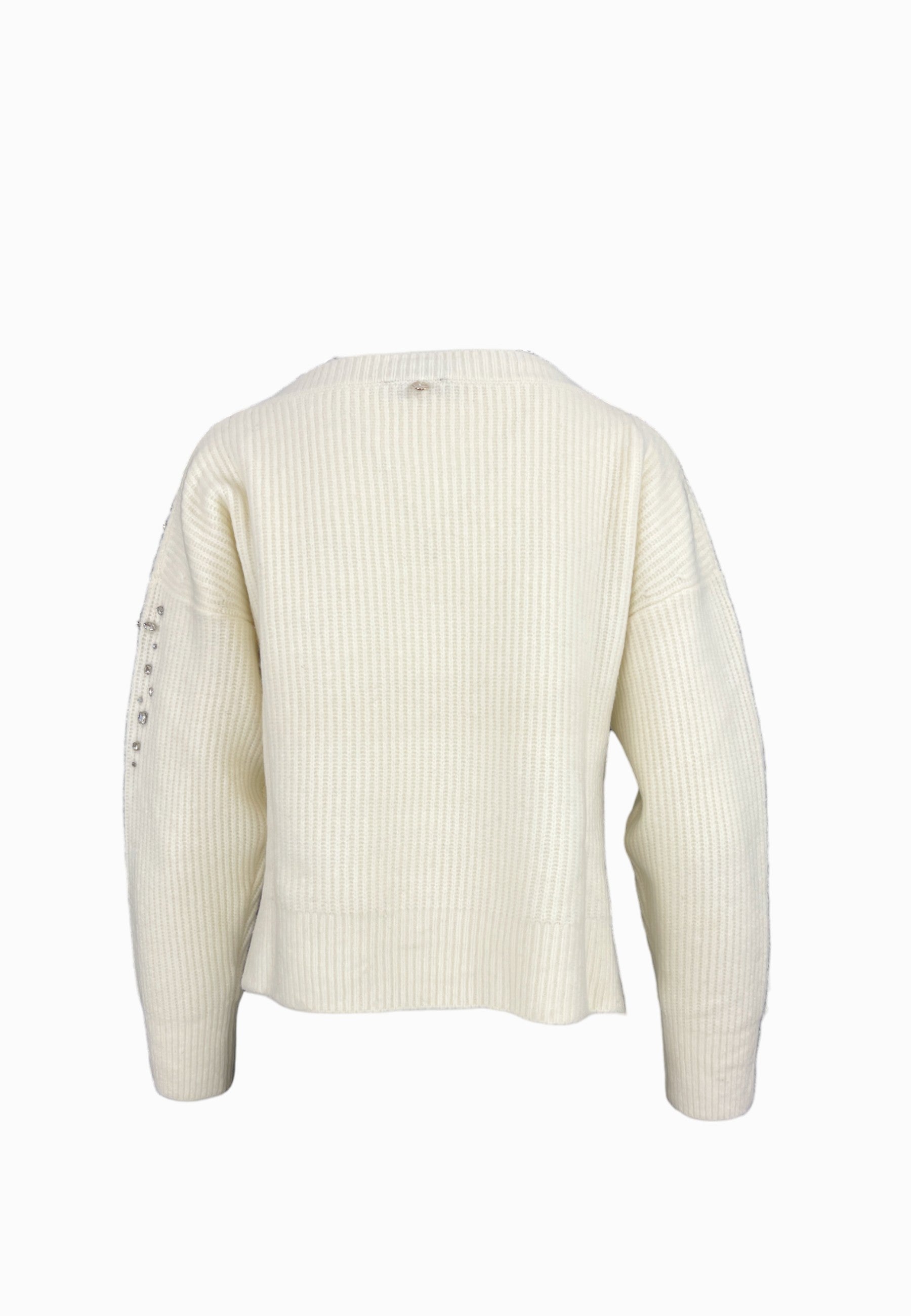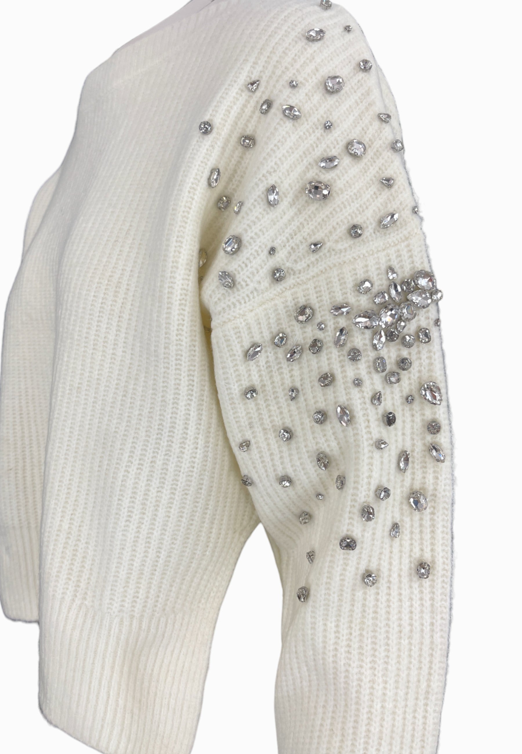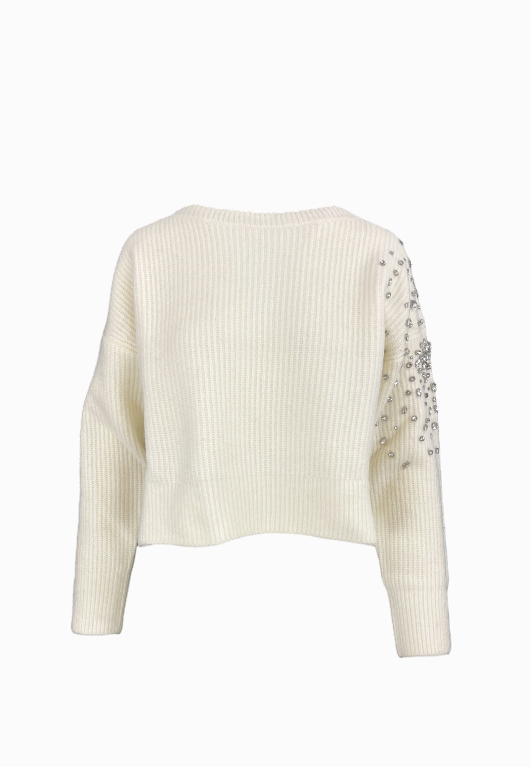 • MAGLIA MANICA LUNGA,SCOLLO A BARCHETTA,DECORAZIONE GIOIELLO SULLA MANICA COLORE ARGENTO