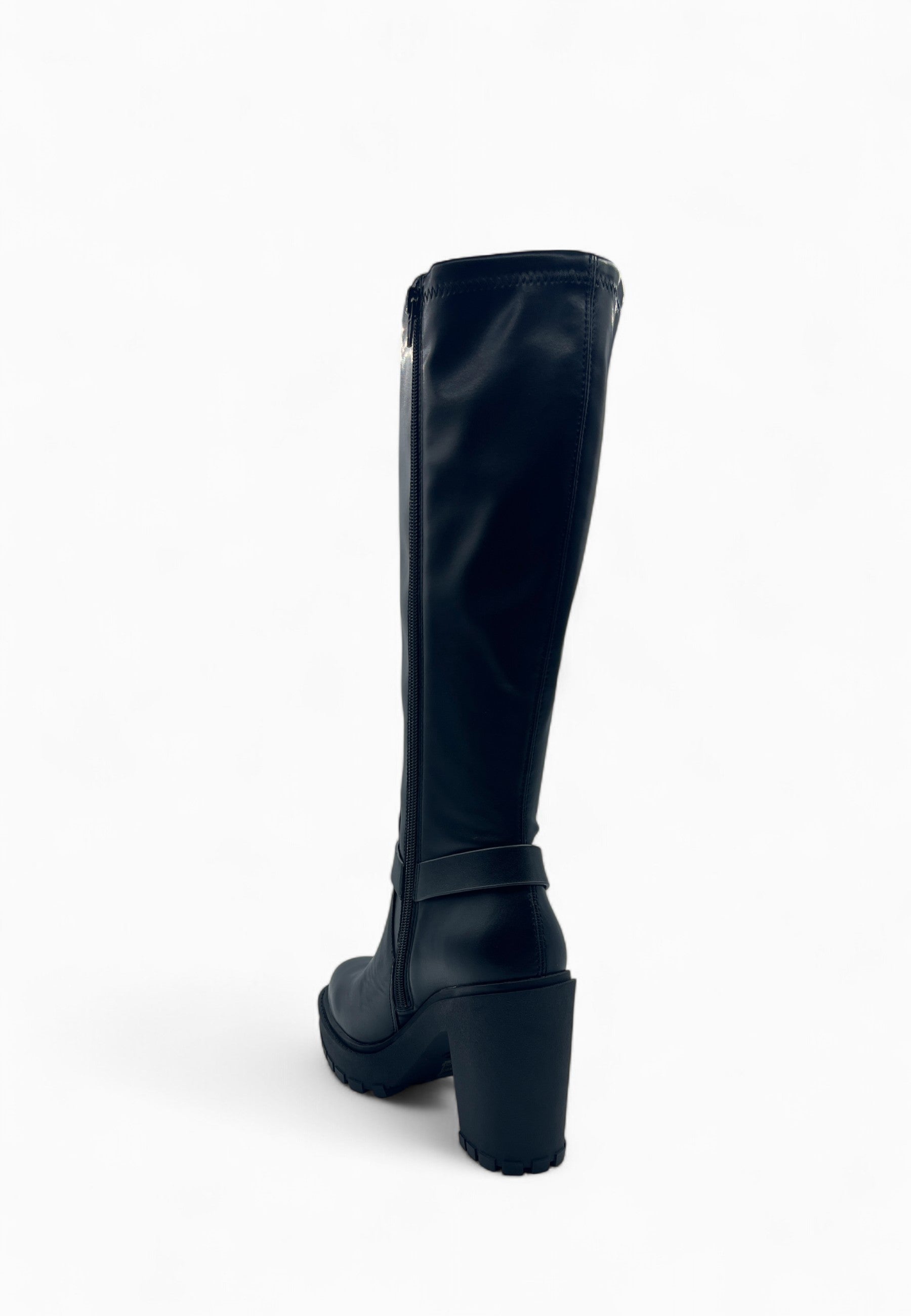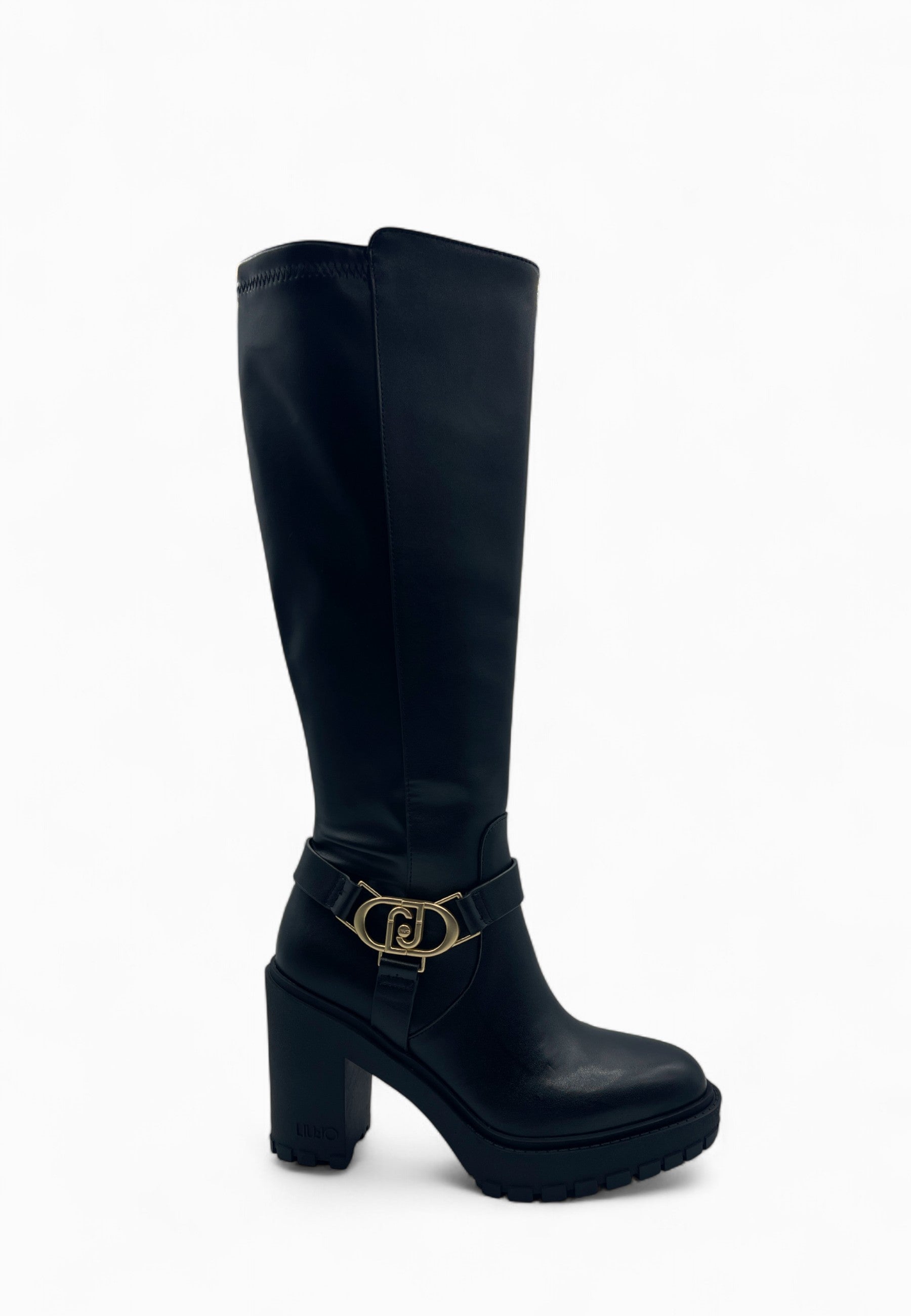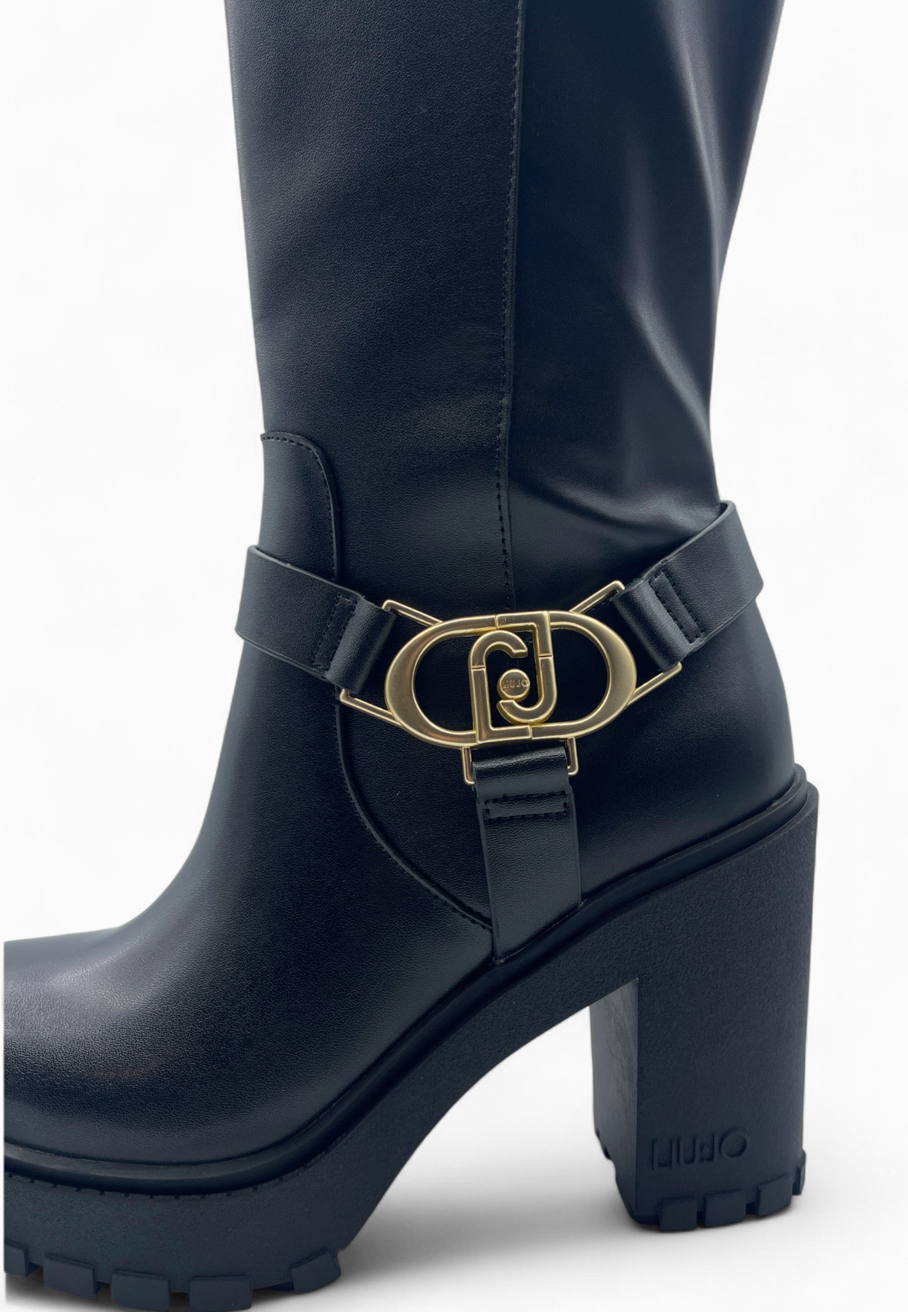 • STIVALI CON TACCO LARGO E GAMBALE ALTO ADERENTE,CORRARMATO, CERNIERA SUL FIANCO, FIBBIA DECORATIVA LOGATA COLORE ORO