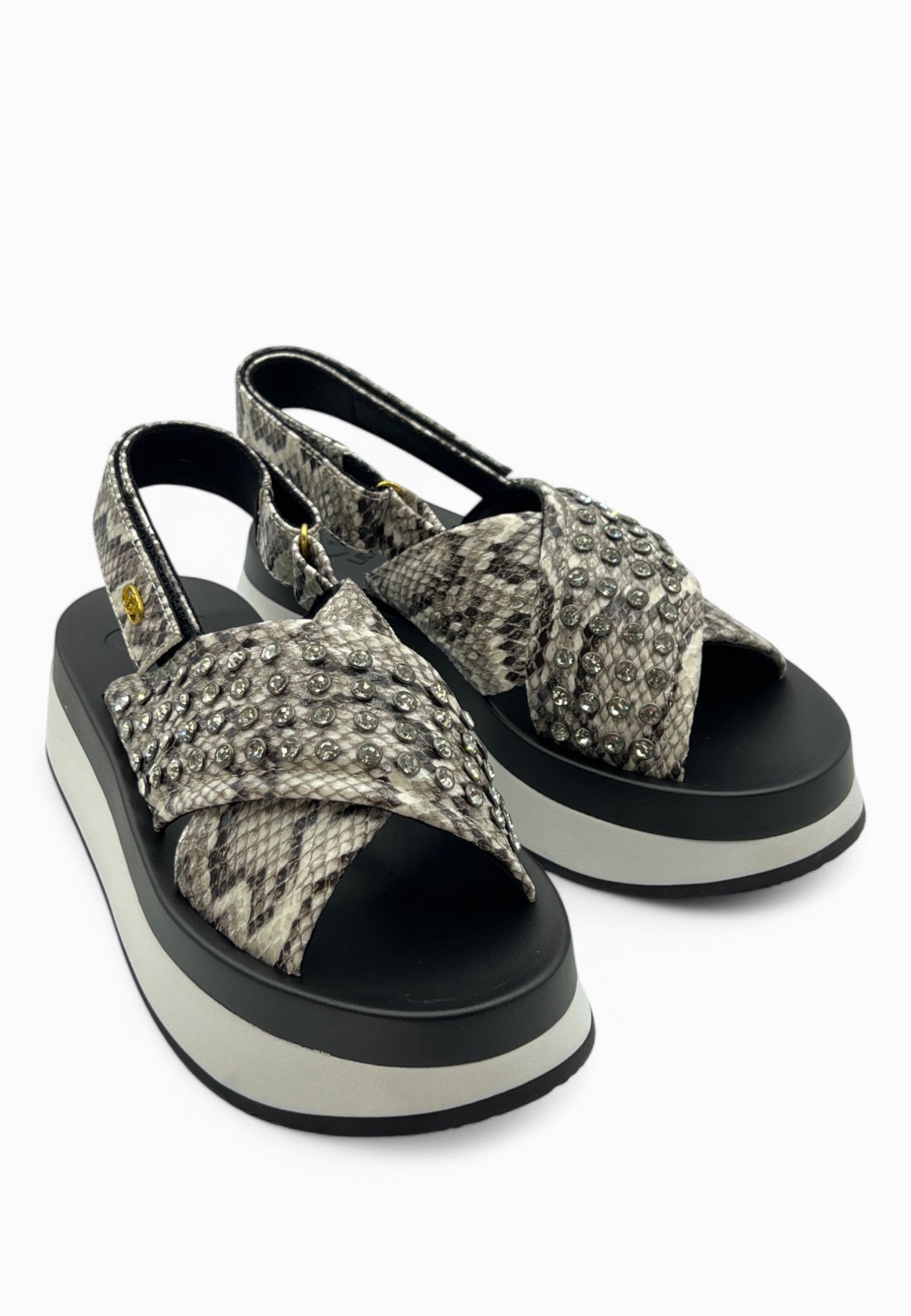 • SANDALO PLATFORM, TOMAIA EFFETTO SERPENTE, DETTAGLI APPLICATI, STRASS, CHIUSURA CON STRAP