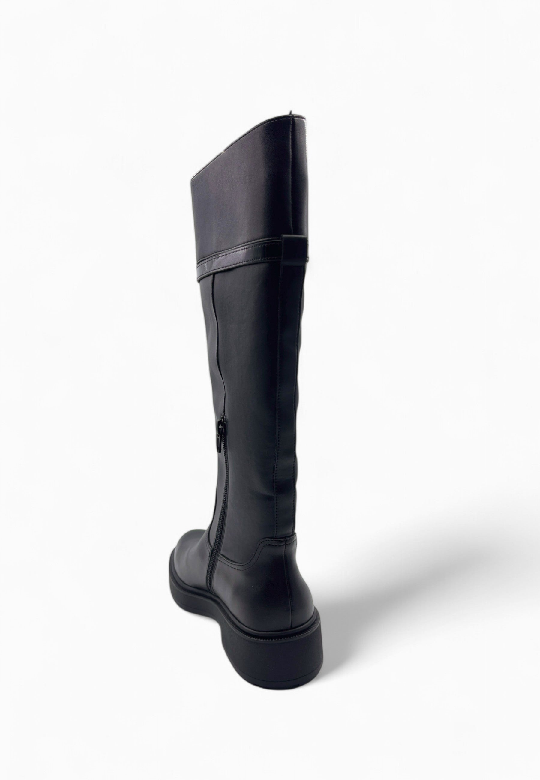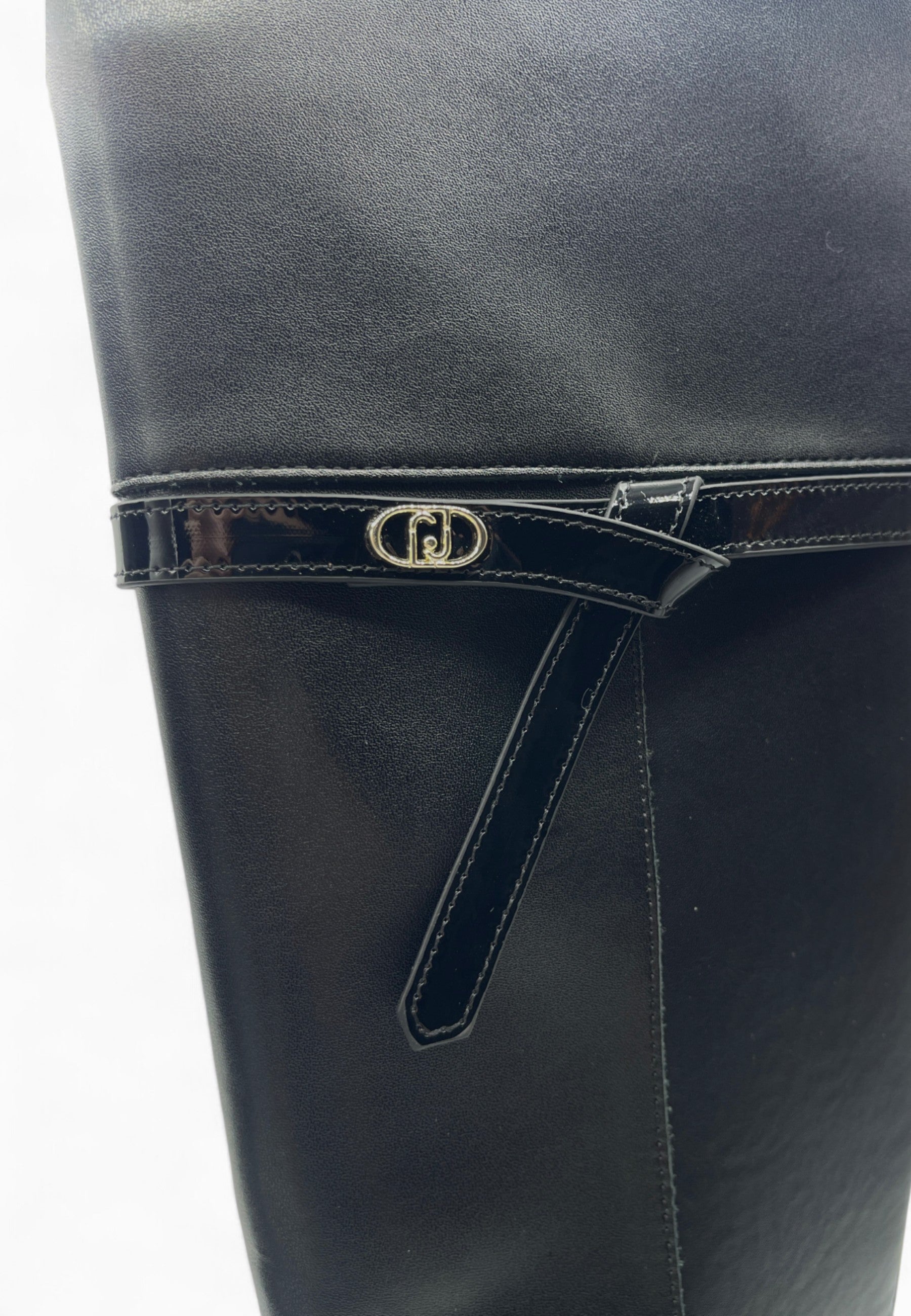 • STIVALE SOTTO AL GINOCCHIO CON SUOLA PLATFORM E LISTINO EFFETTO VERNICE APPLICATO CON LOGO ICONICO