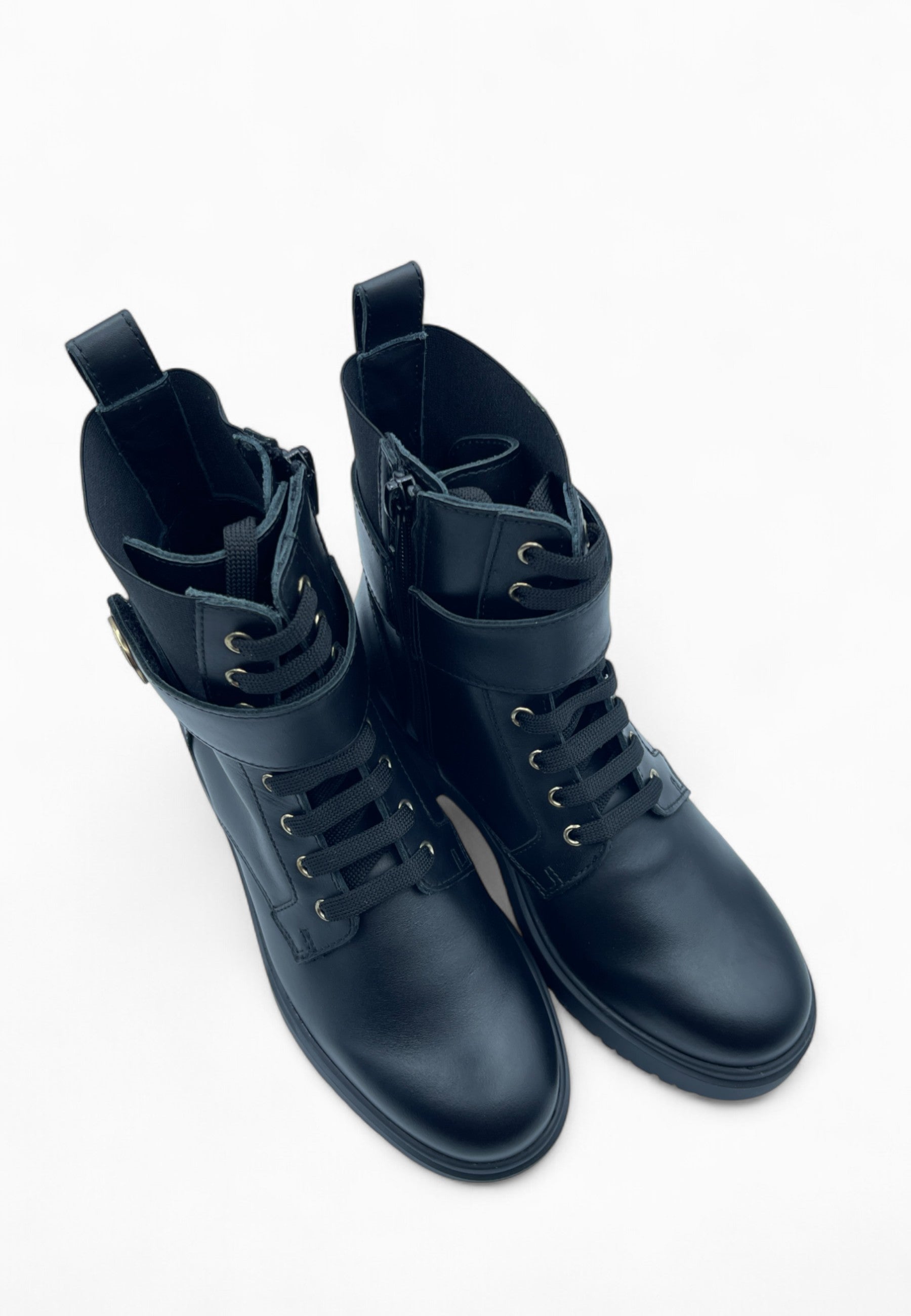 • ANFIBIO STRINGATO CON CERNIERA, FIBBIA ALLA CAVIGLIA CON LOGO COLORE ORO