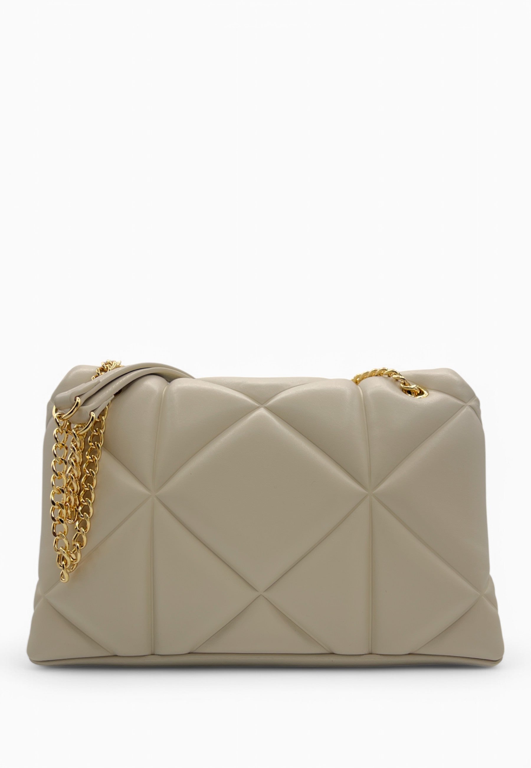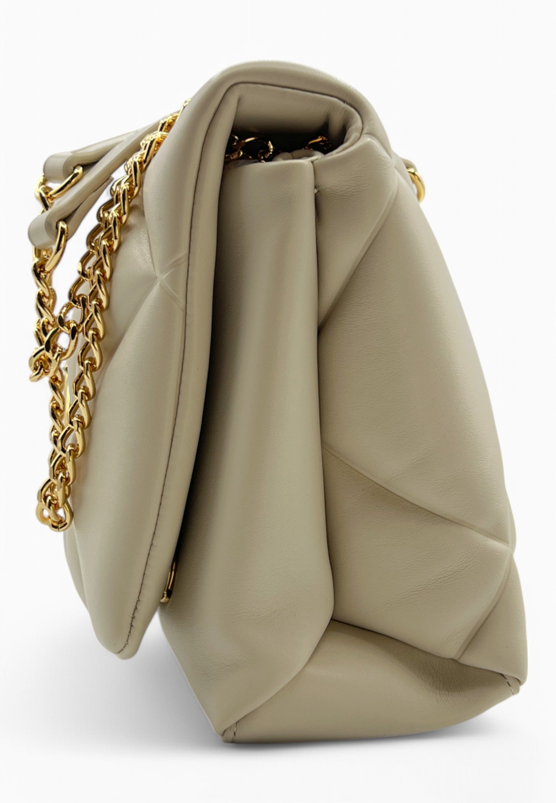 • BORSA A SPALLA, A TRACOLLA, MORBIDA ECOPELLE TRAPUNTATA, LOGO ICONICO COLOR ORO ANTICATO, CHIUSURA A BOTTONI, UNO SCOMPARTO, ZIP INTERNA