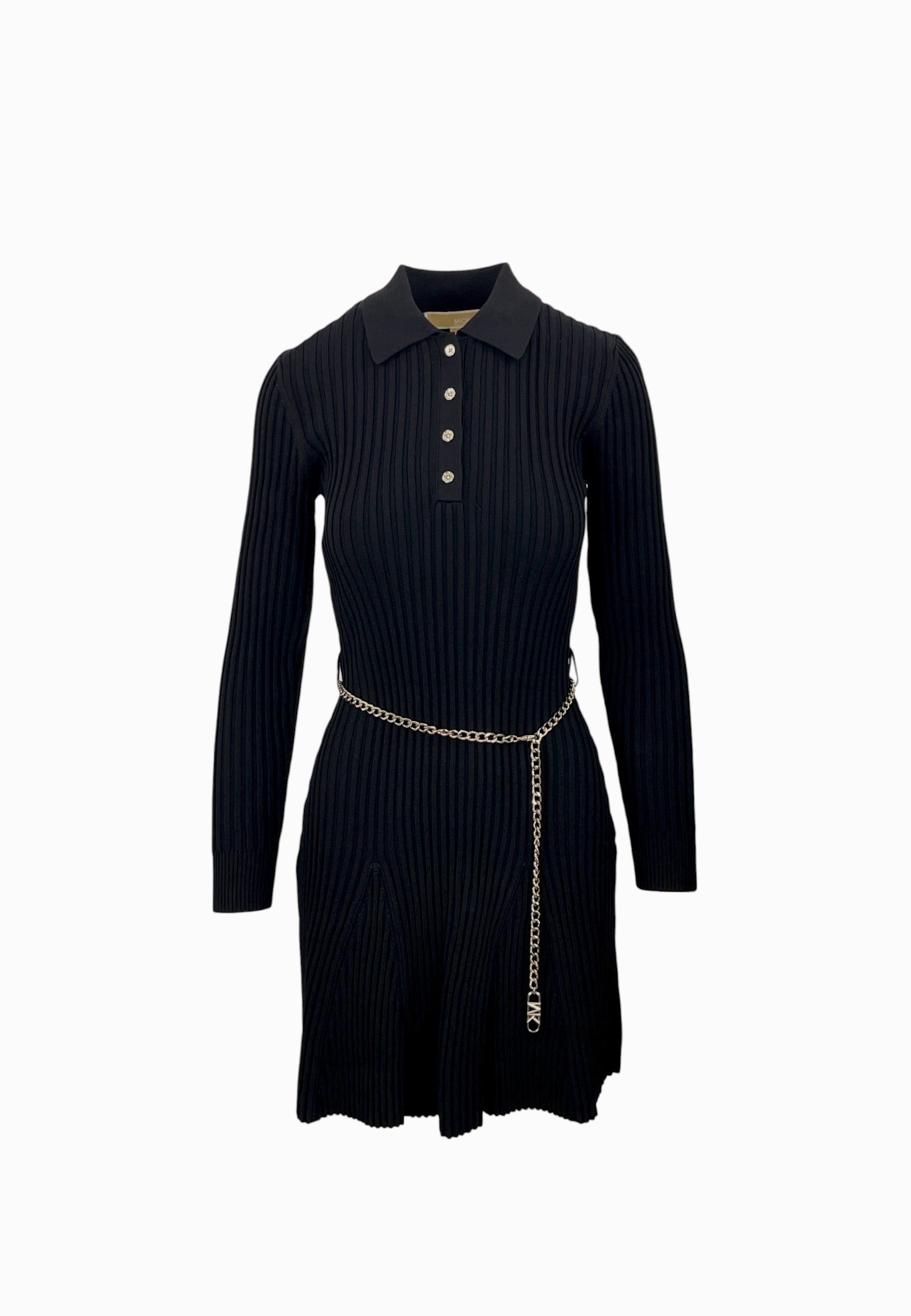 • ABITO ACCOLLATO CORTO CON MANICA LUNGA CON CINTURA A CATENA E BOTTONI ANTERIORI COLOR ARGENTO
