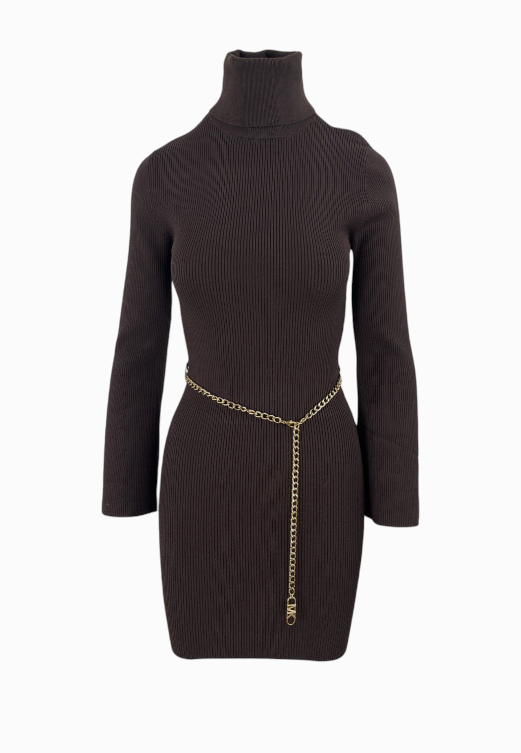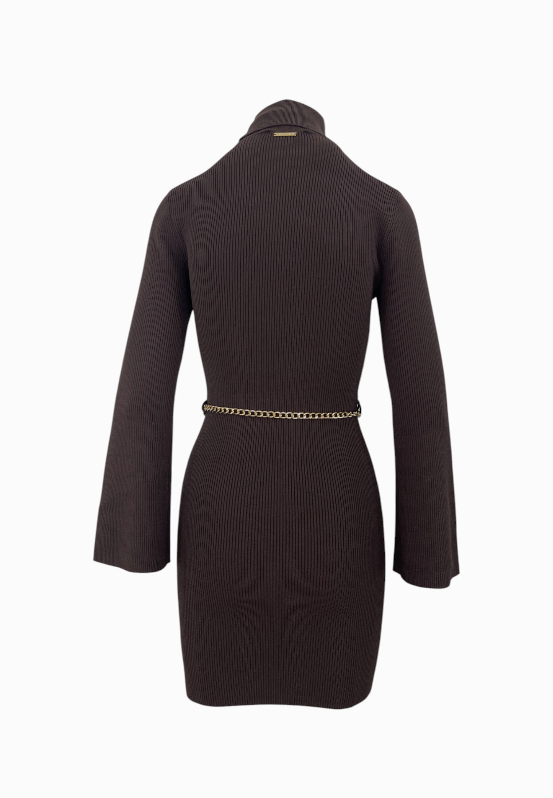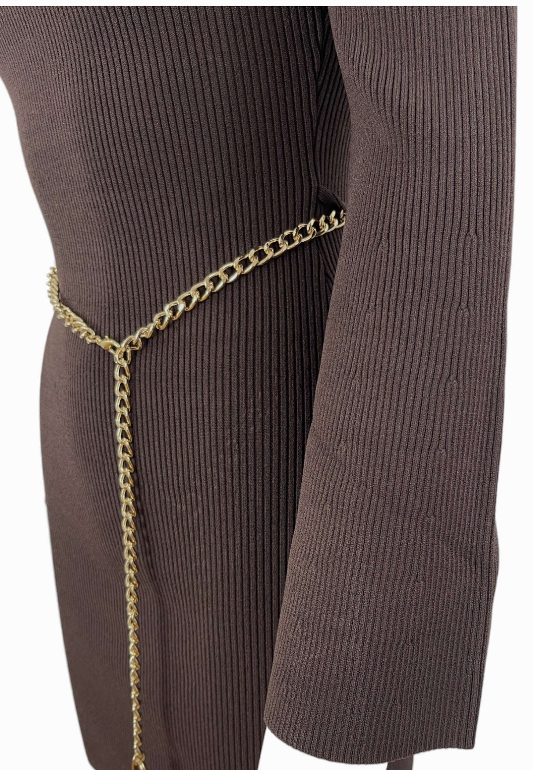 • ABITO MANICA A CAMPANA ,LAVORAZIONE A COSTINE,COLLO DOLCEVITA,COMPRESO DI CINTURA A CATENA CON LOGO