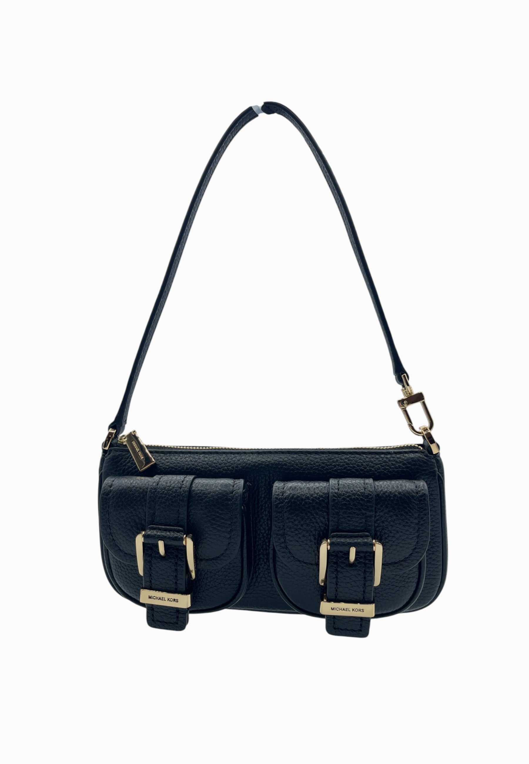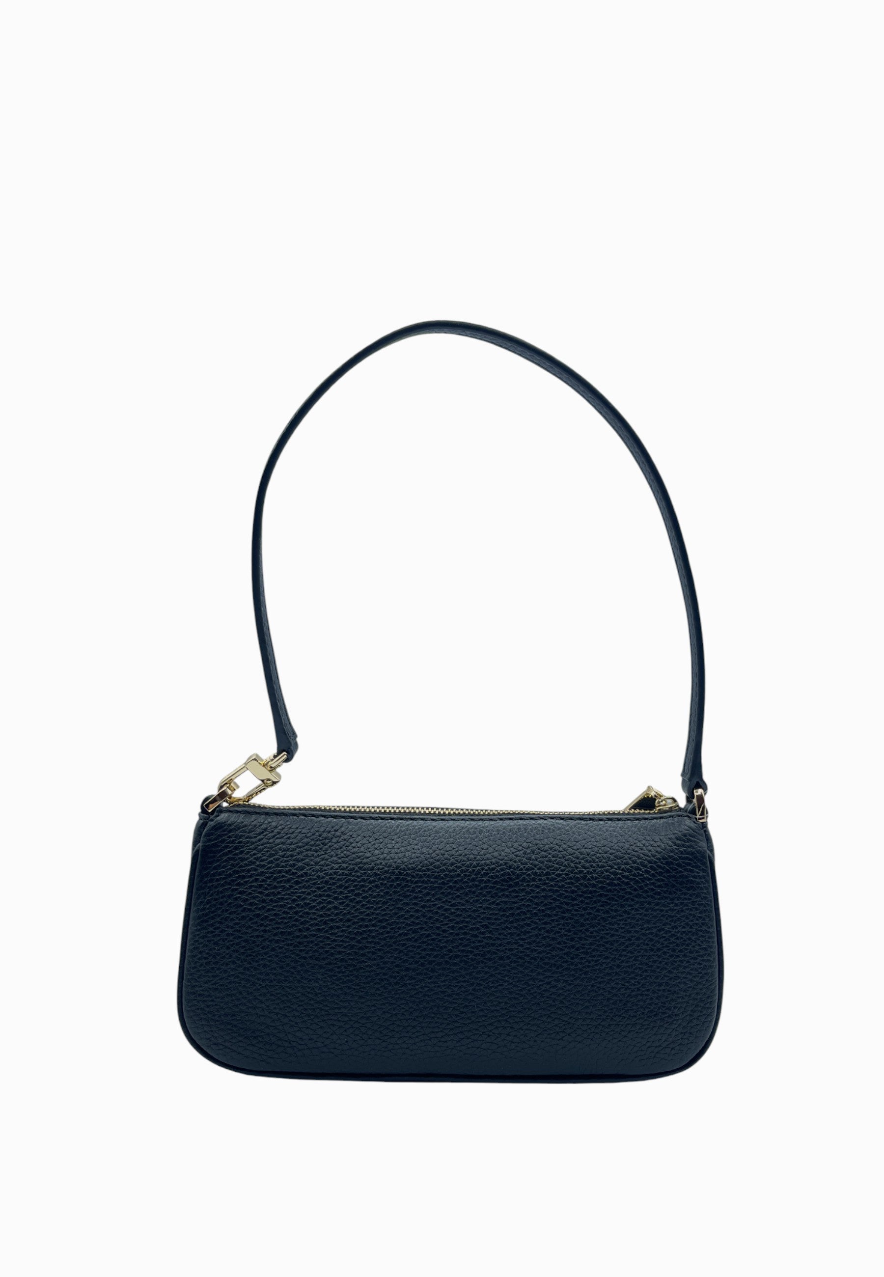 • BORSETTA CON CHIUSURA A CERNIERA,DUE TASCHE ESTERNE CON BOTTONI A PRESSIONE E FIBBIA COLORE ORO, PORTABILE A SPALLA