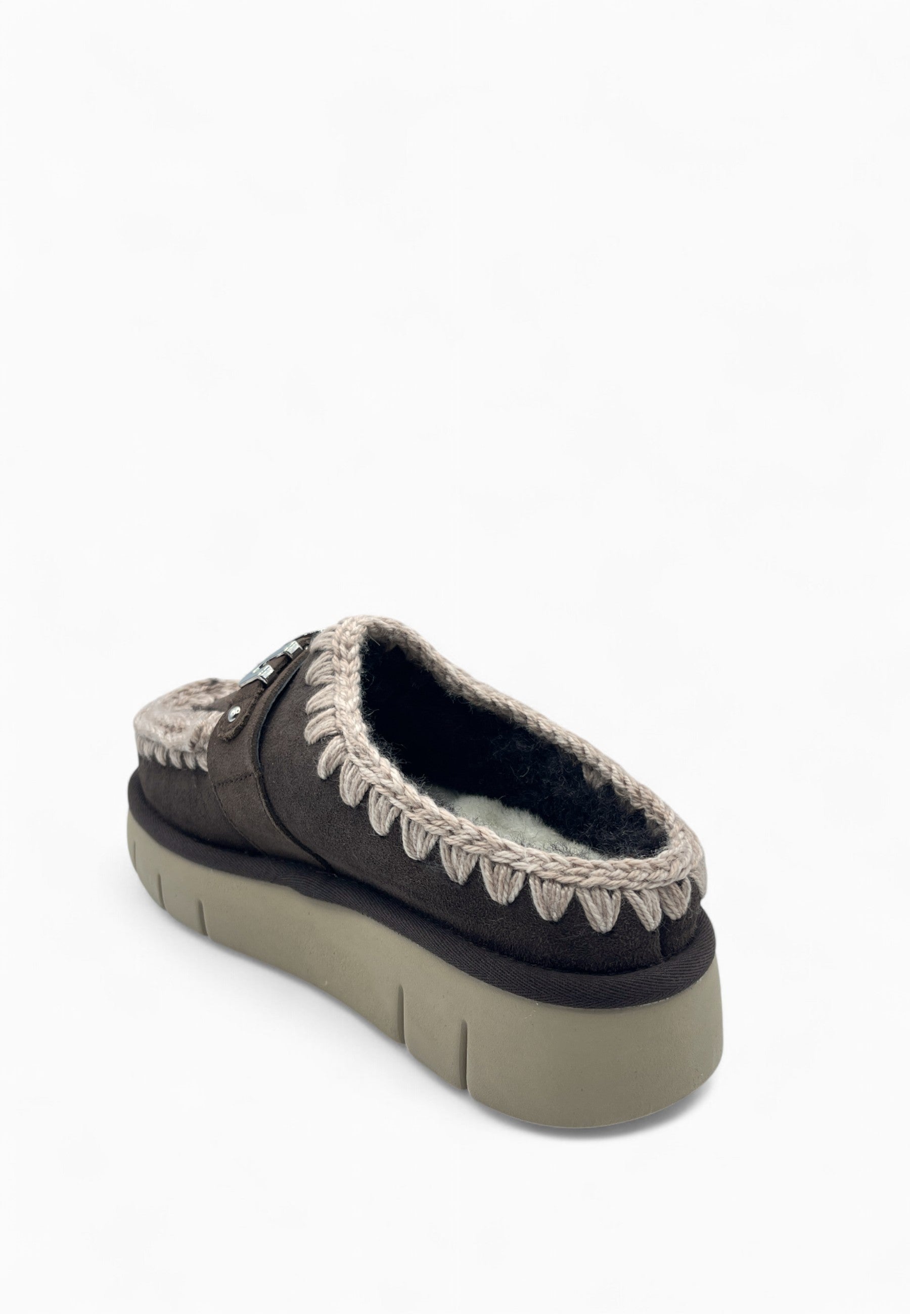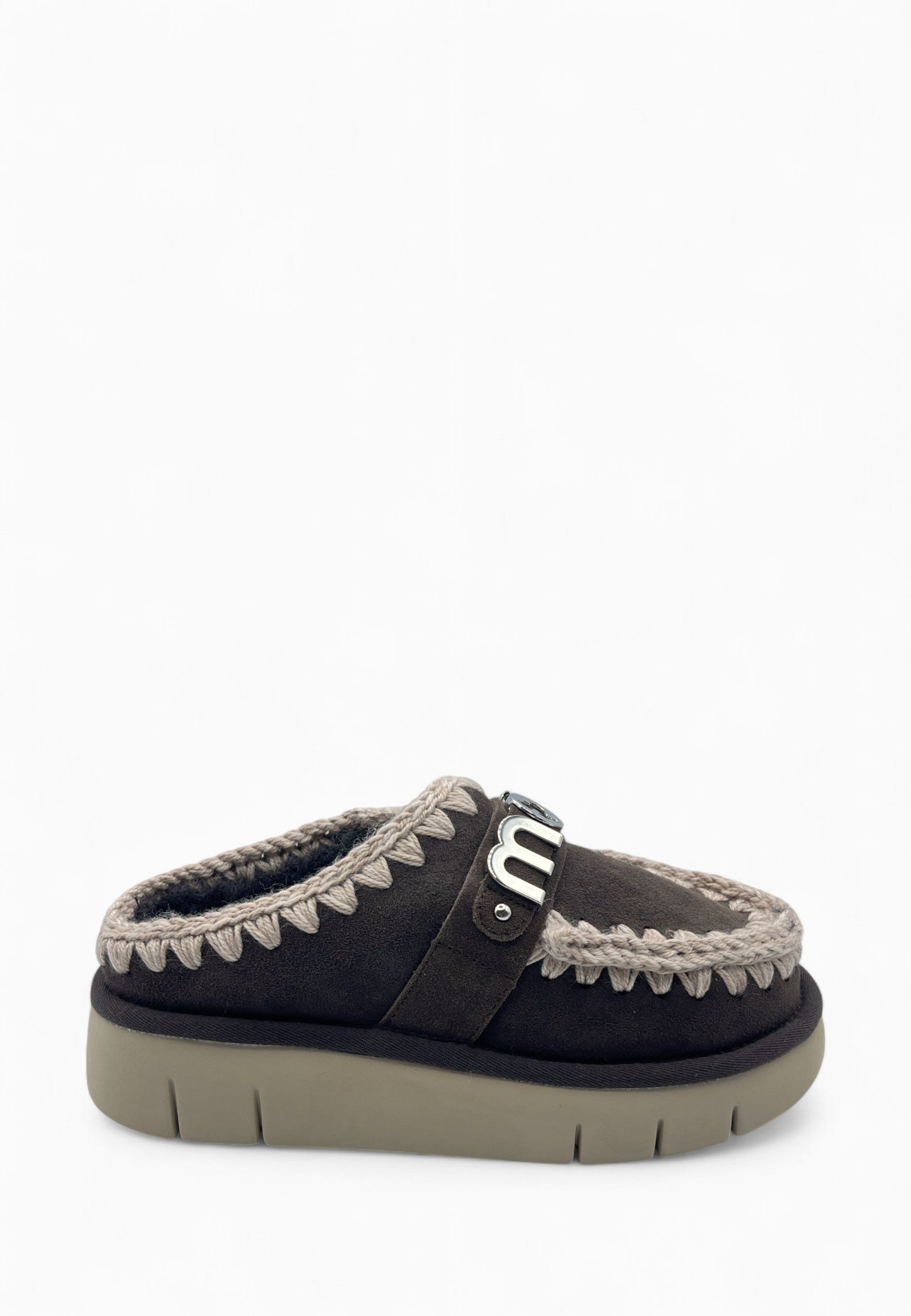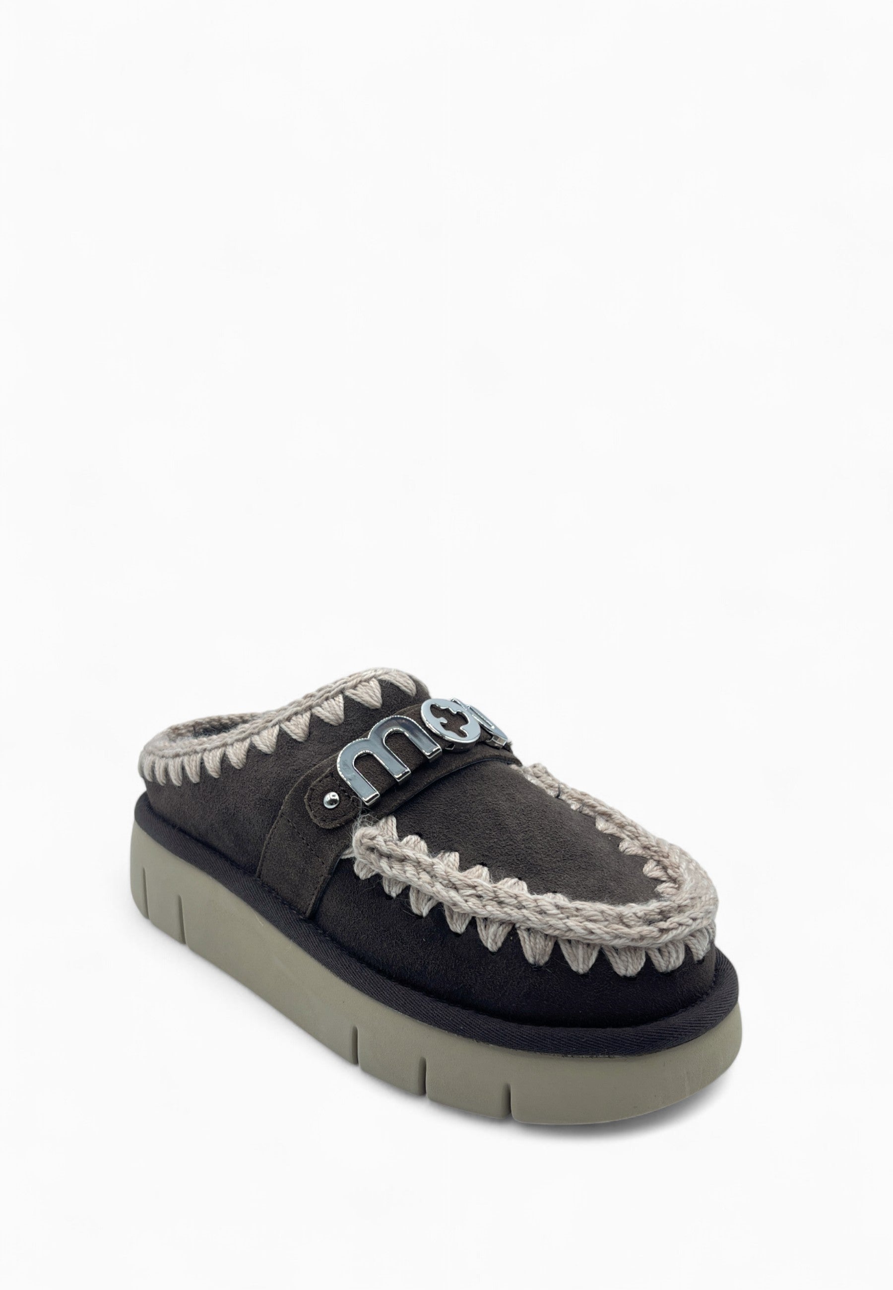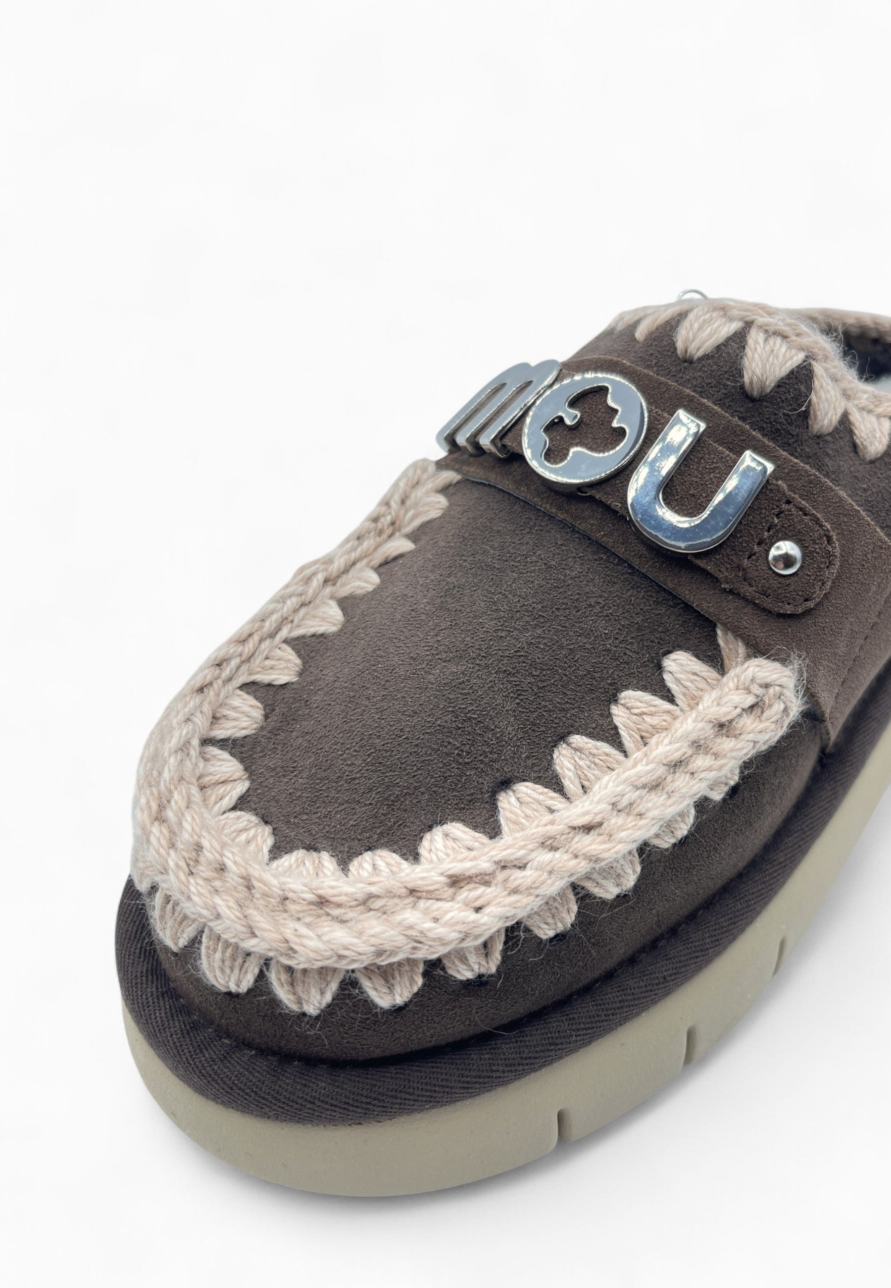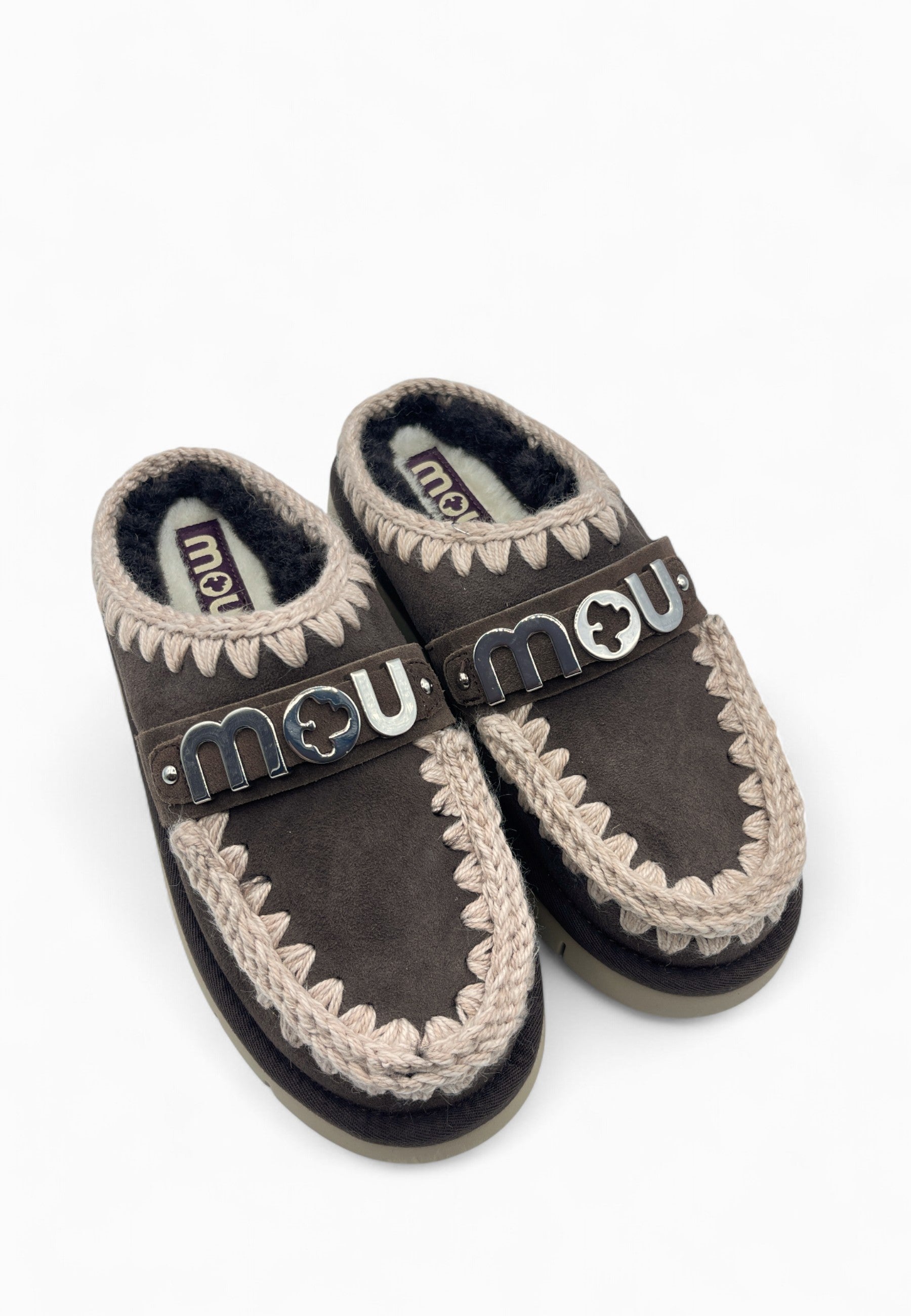 • CIABATTA IMBOTTITA RIFINITA CON CUCITURA A MANO, LOGO COLORE ARGENTO EFFETTO FIBBIA DECORATIVA