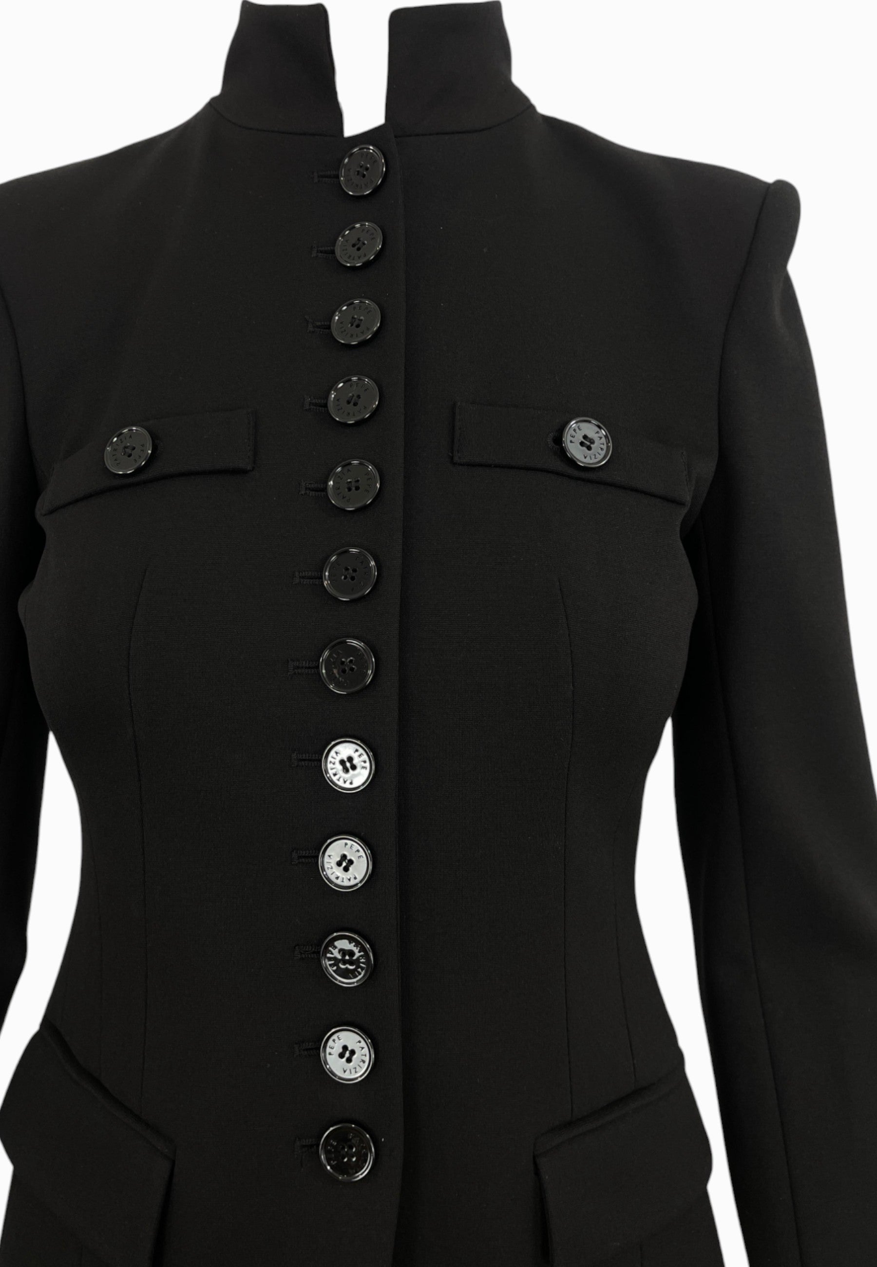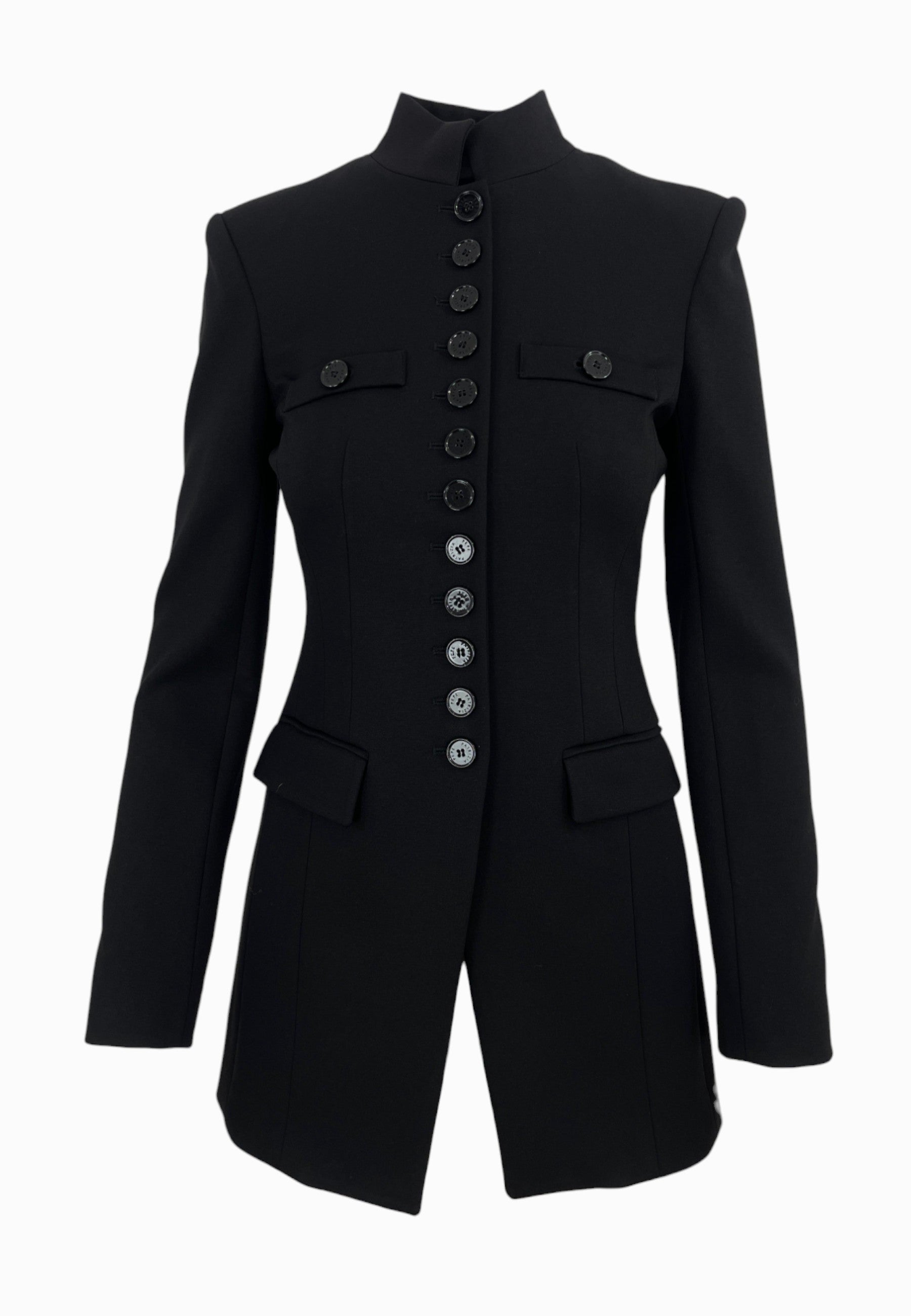 • GIACCA MONOPETTO CON CHIUSURA A BOTTONI, COLLETTO ALTO, QUATTRO TASCHE E PLACCHETTA LOGATA SUL RETRO