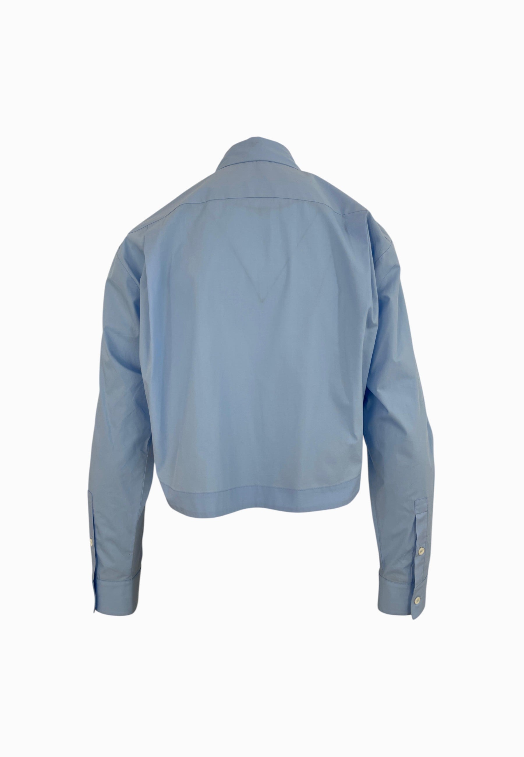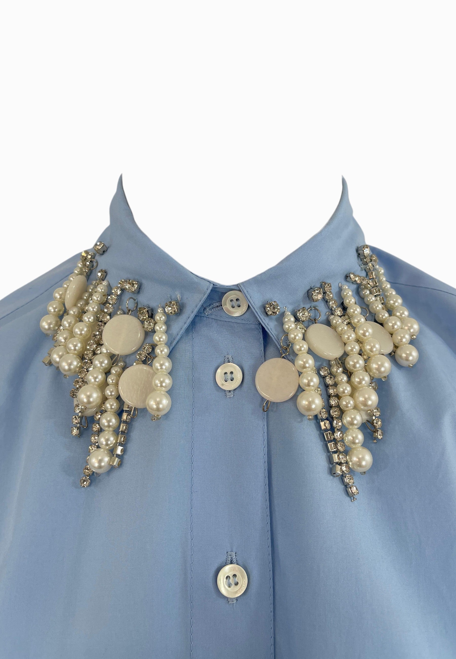 • CAMICIA CROPPED CON MANICHE LUNGHE, CHIUSURA A BOTTONI E DETTAGLI GIOIELLO APPLICATI AL COLLETTO
