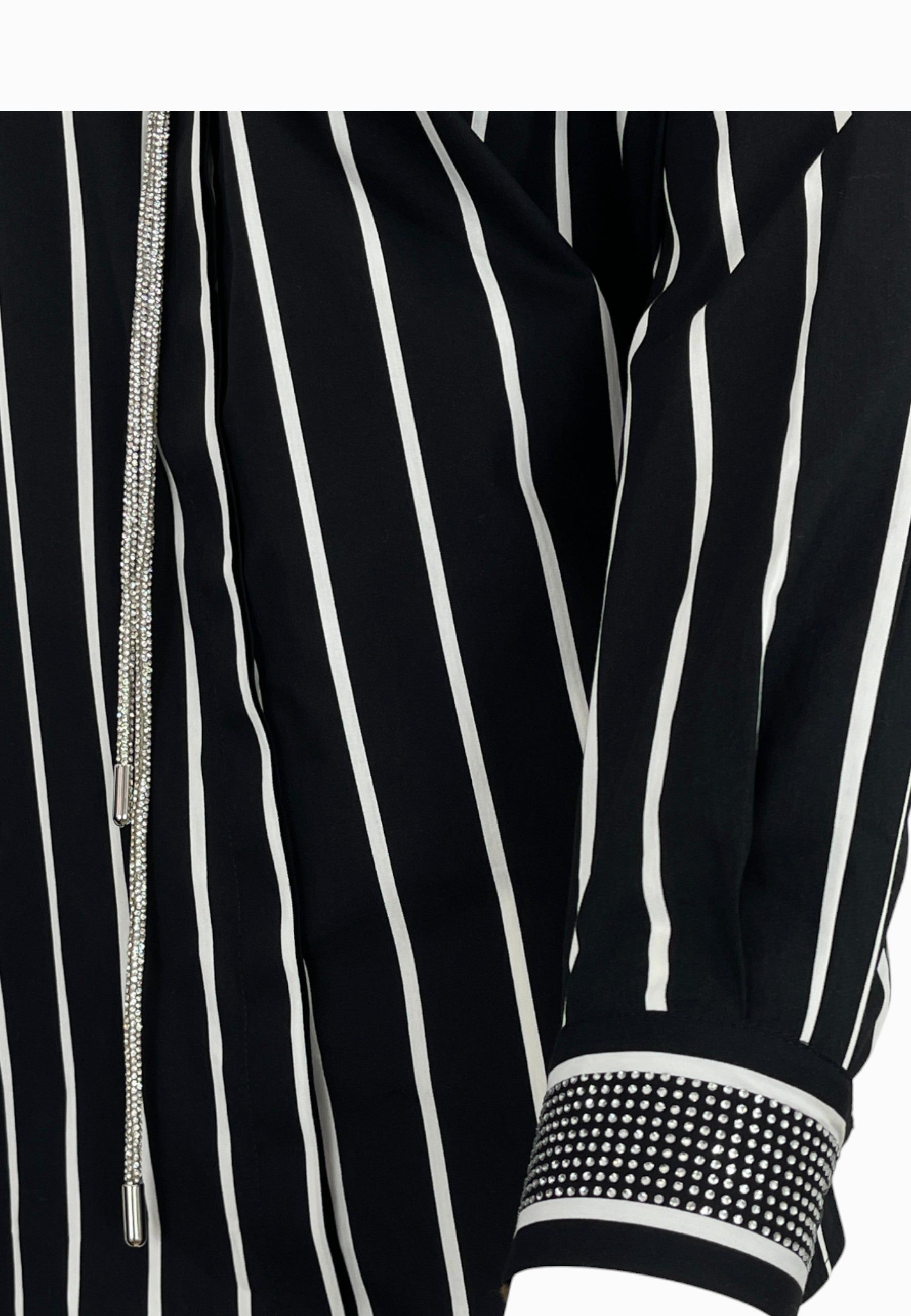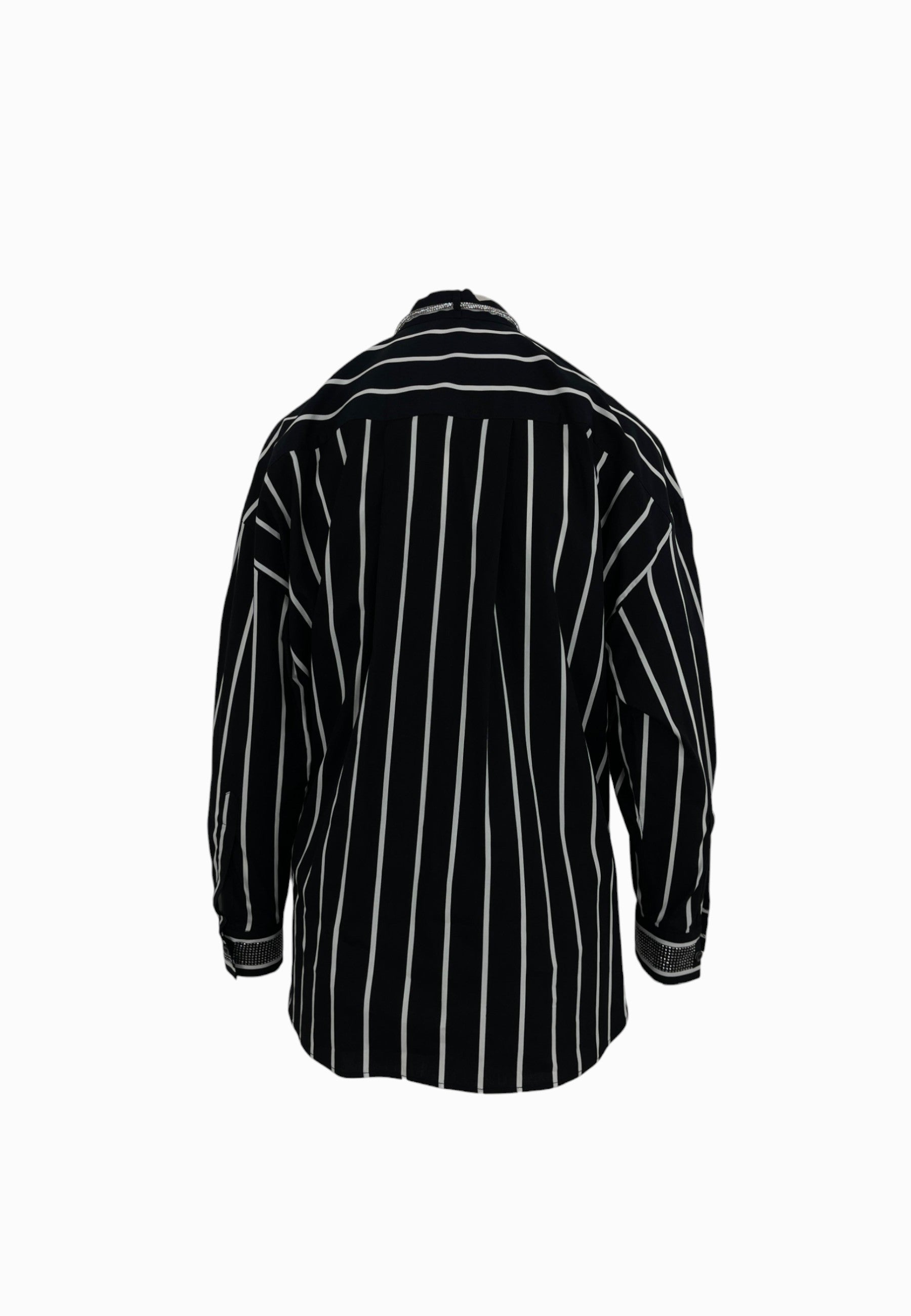• CAMICIA OVER CON STAMPA A RIGHE, CHIUSURA A BOTTONI, COLLETTO COREANO, LACCETTO CON STRASS APPLICATO AL COLLETTO E LOGO ICONICO RICAMATO