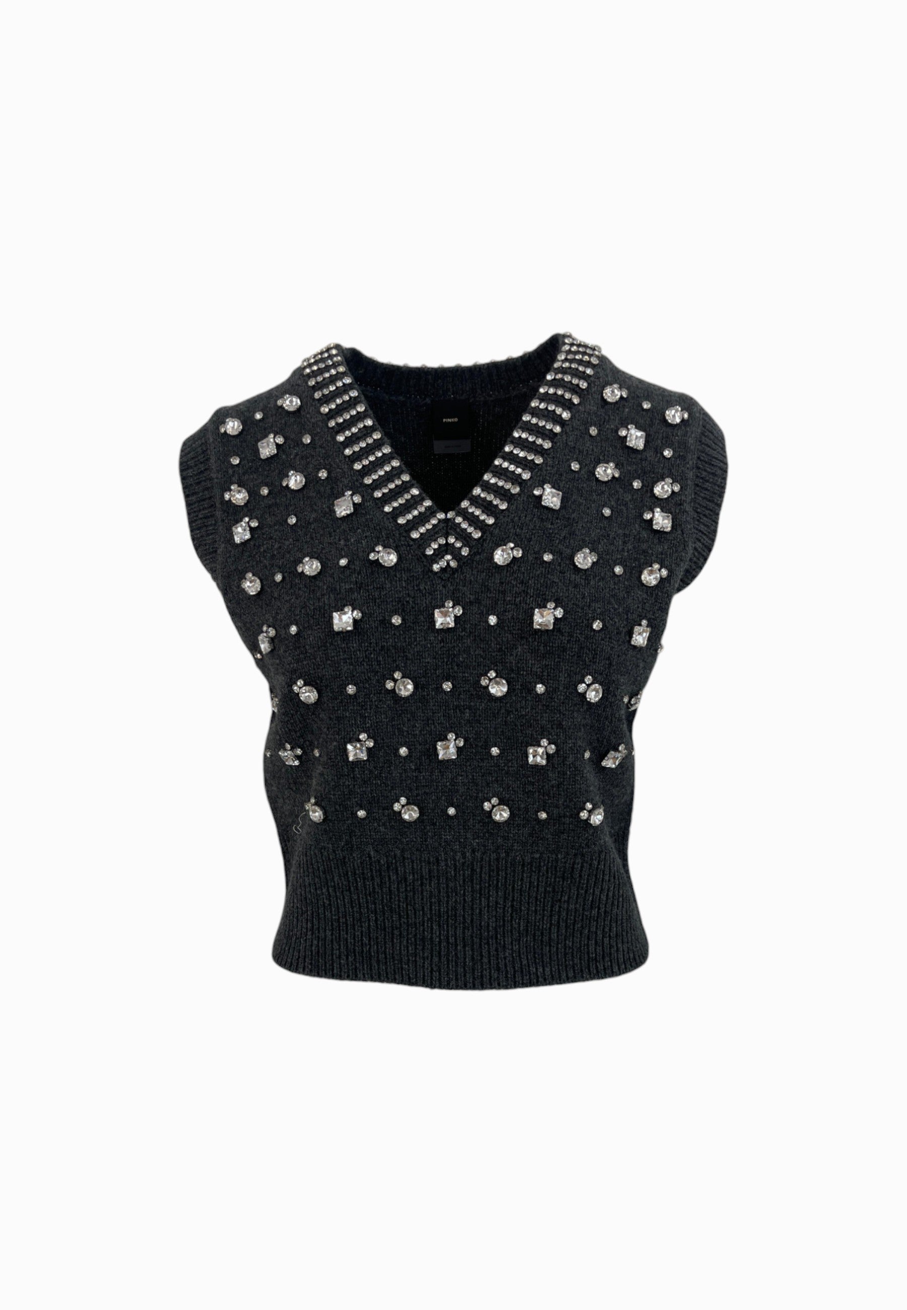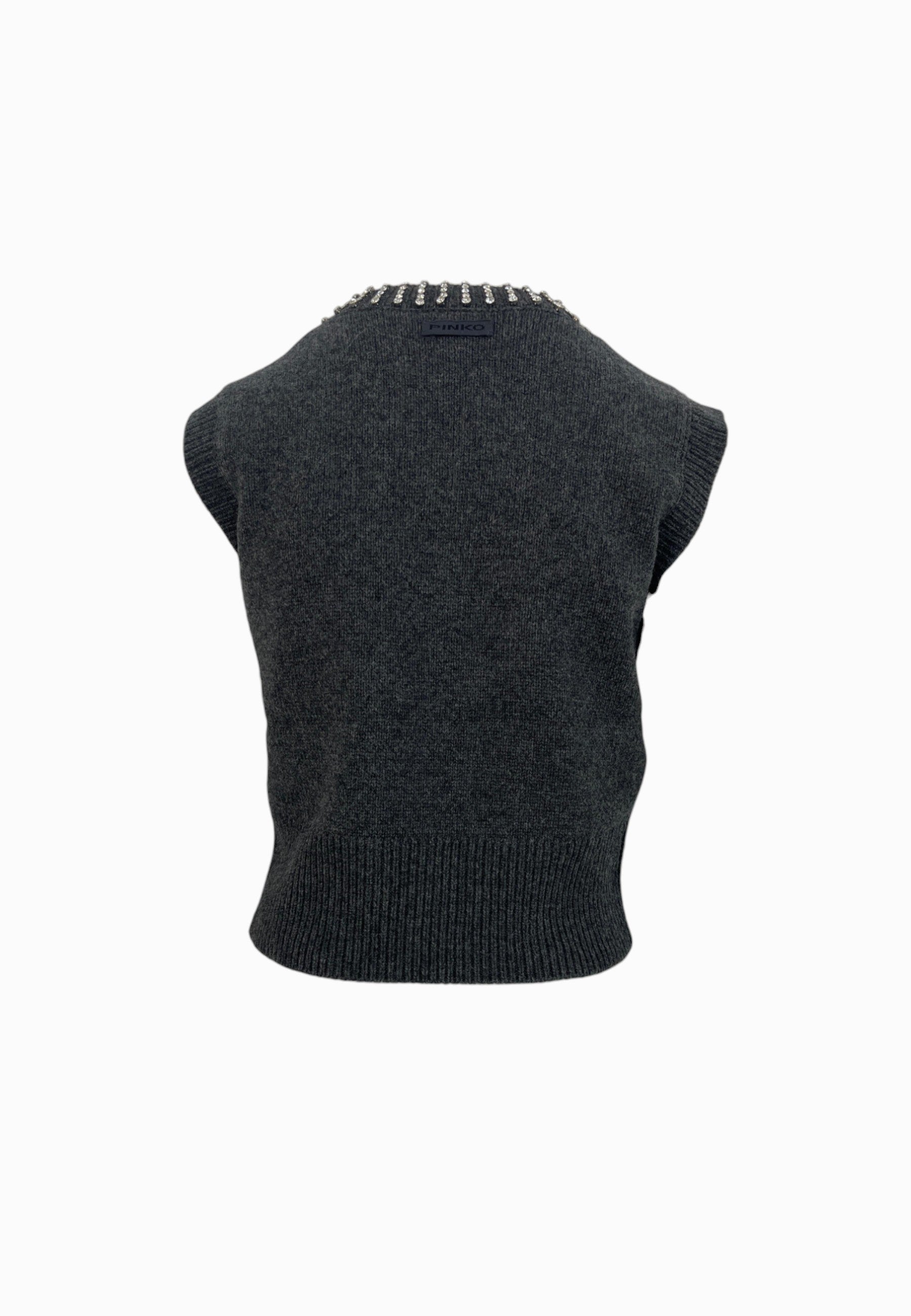 • GILET IN MAGLIA CON COLLO A V E DETTAGLI IN STRASS APPLICATI