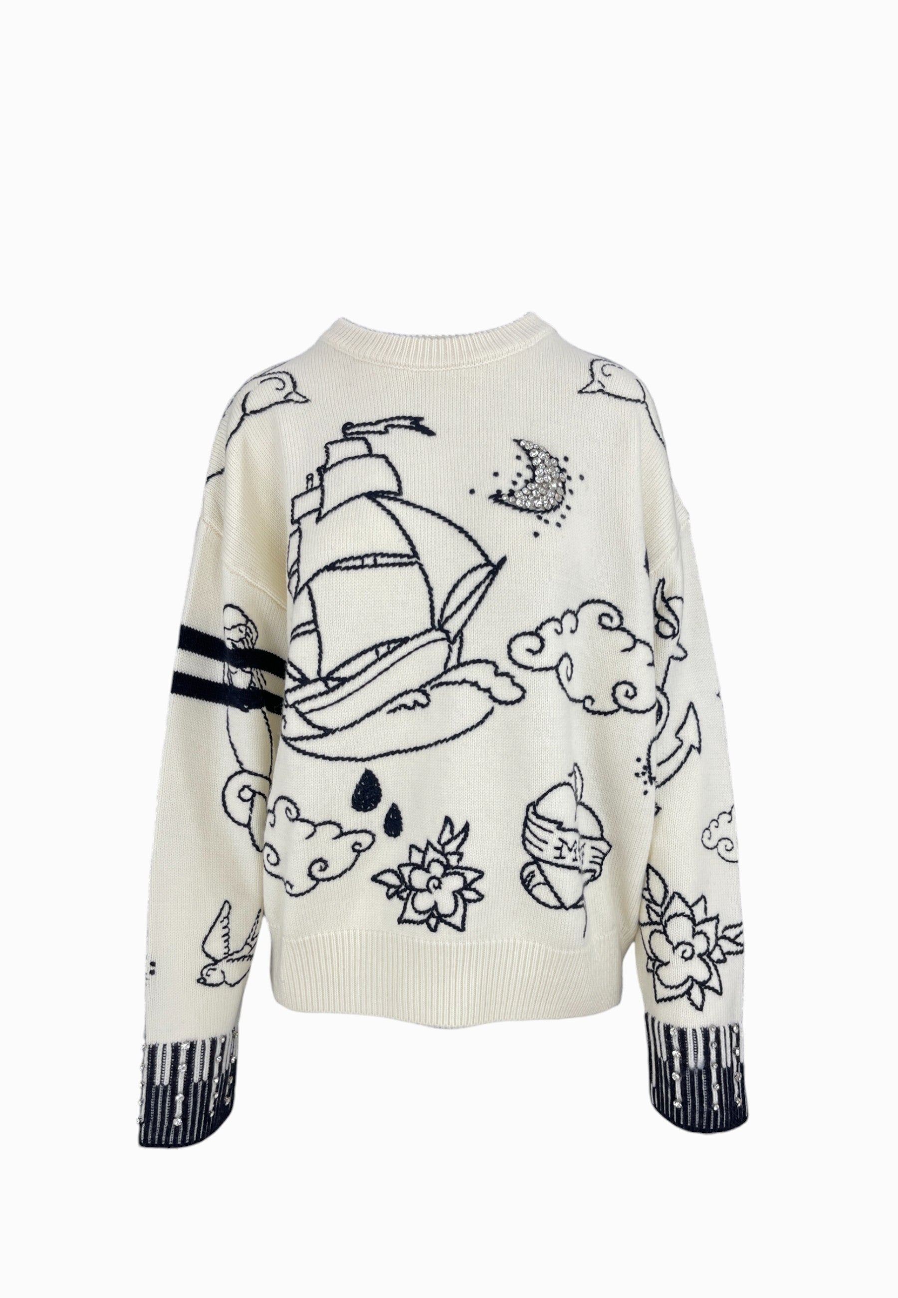 • MAGLIA GIROCOLLO CON RICAMI IN CONSTRASTO FILO NERO,DISEGNI OLD SCHOOL, DETTAGLI STRASS COLORE ARGENTO