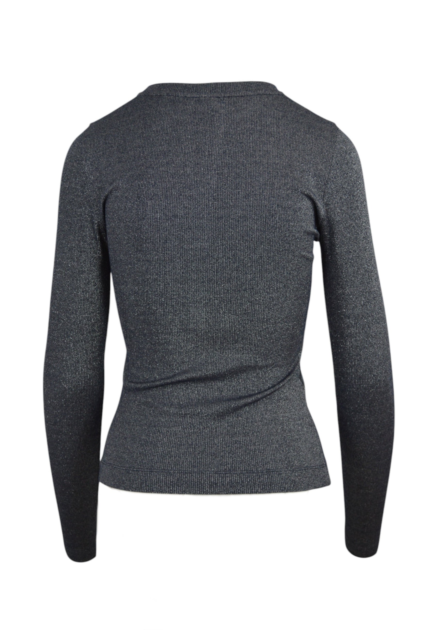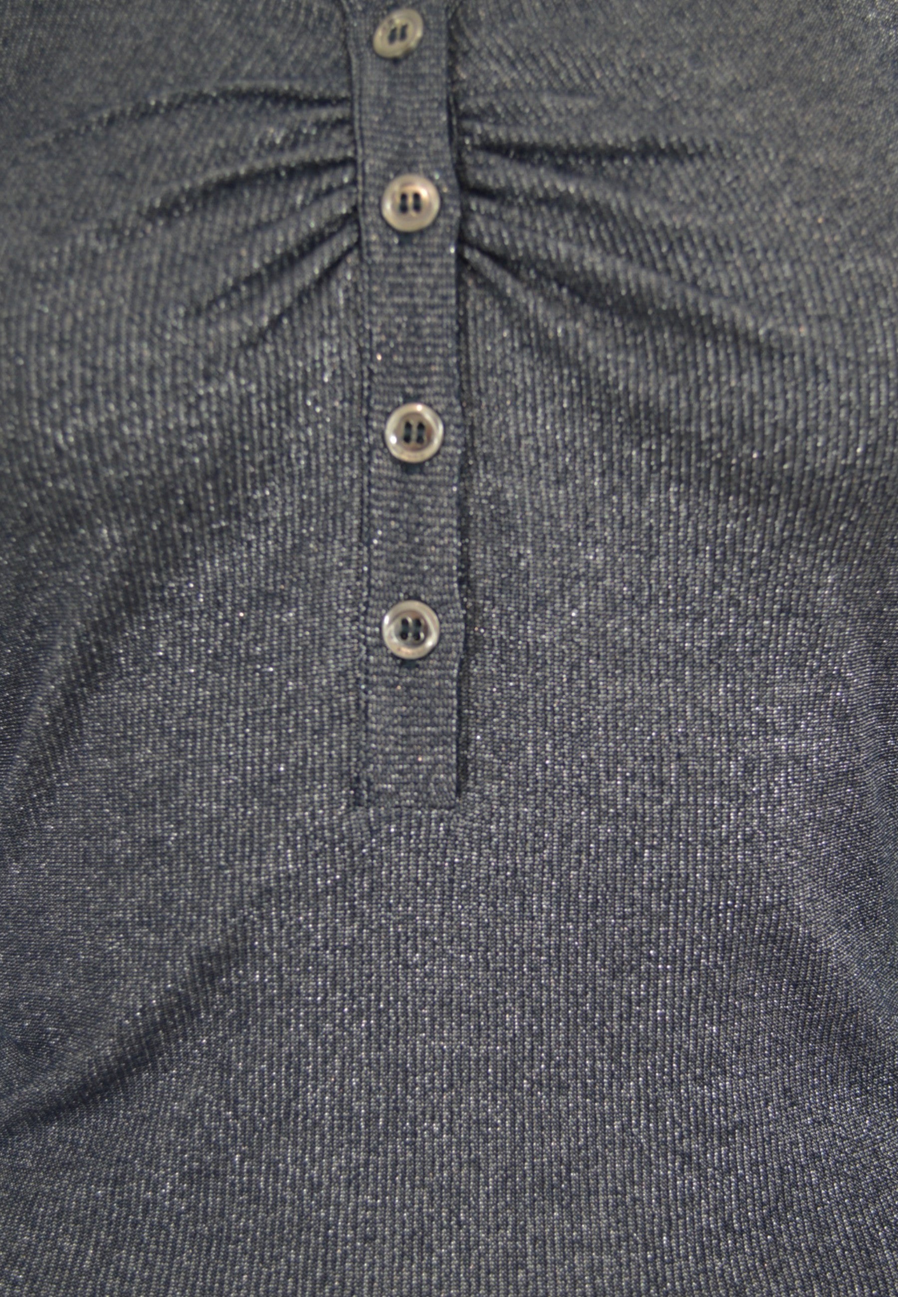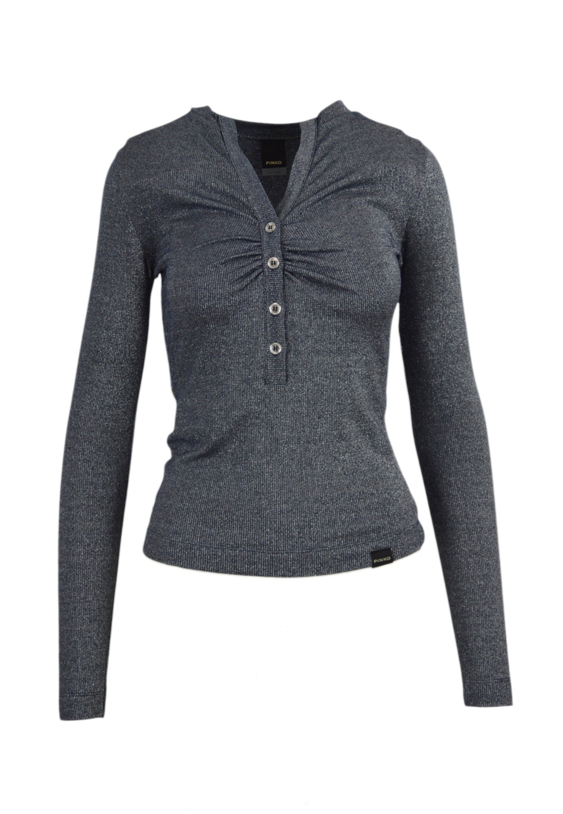 • MAGLIA ELASTICIZZATA, MISTO VISCOSA, MANICHE LUNGHE, MEZZA FILA DI BOTTONI, COLLO A V, TRAME IN LUREX