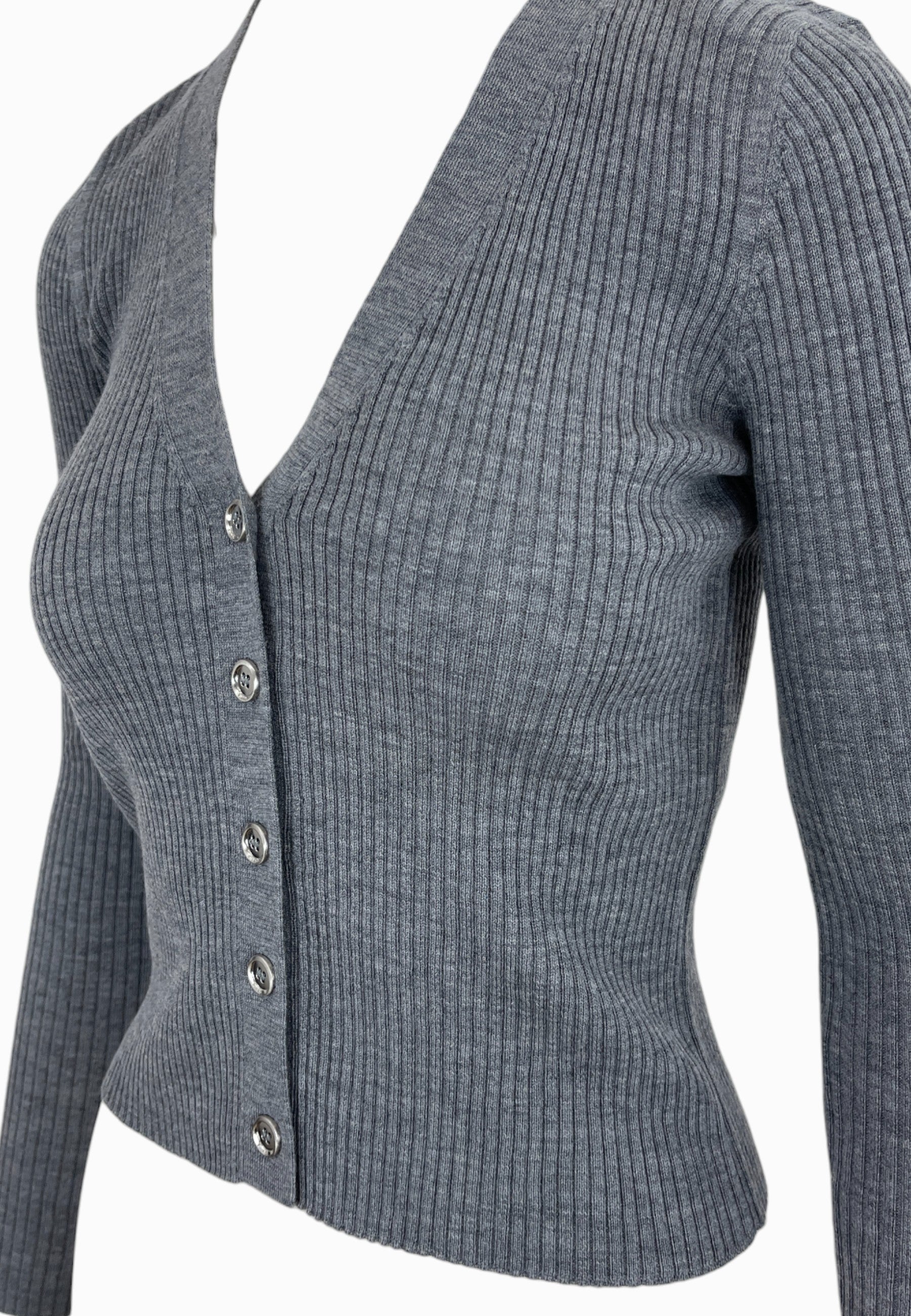 • CARDIGAN CORTO A COSTINE,CHIUSURA CON BOTTONI,LOGO IN TRASPARENZA SULLA PARTE POSTERIORE