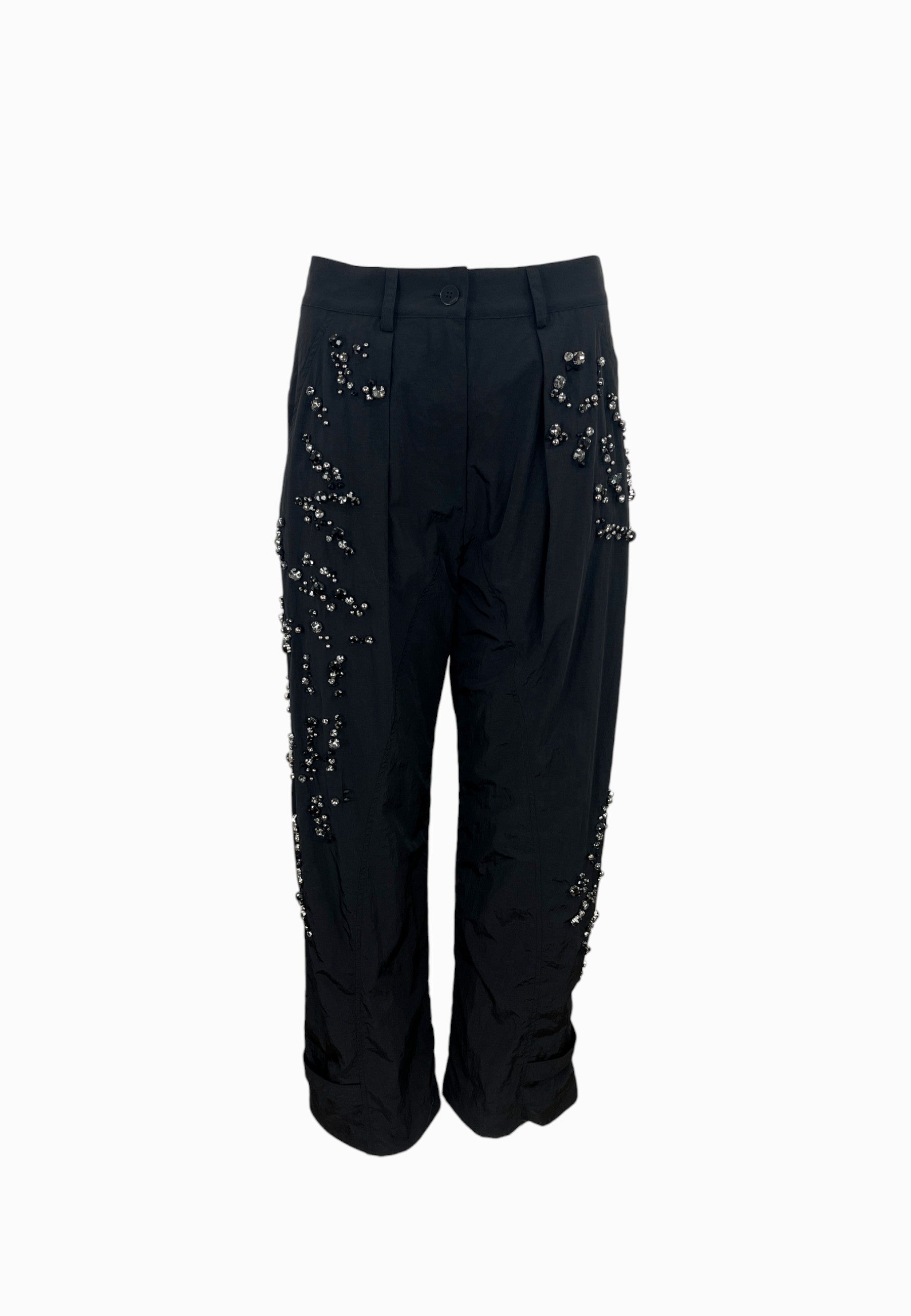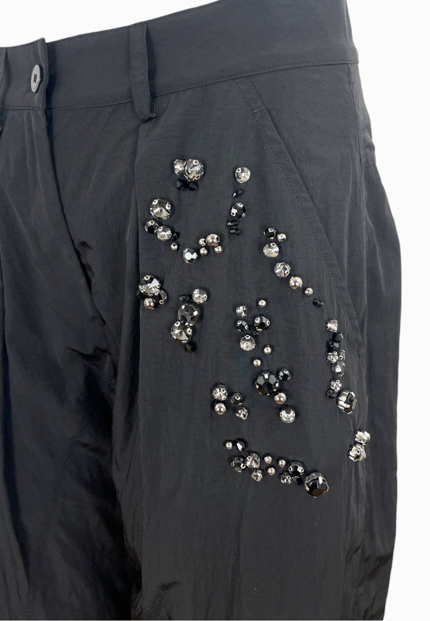 • PANTALONE MODELLO BALOON CON PINCES,TESSUTO TECNICO,FONDO REGOLABILE DA BOTTONE,IMPREZIOSITO DA PIETRE GIOIELLO