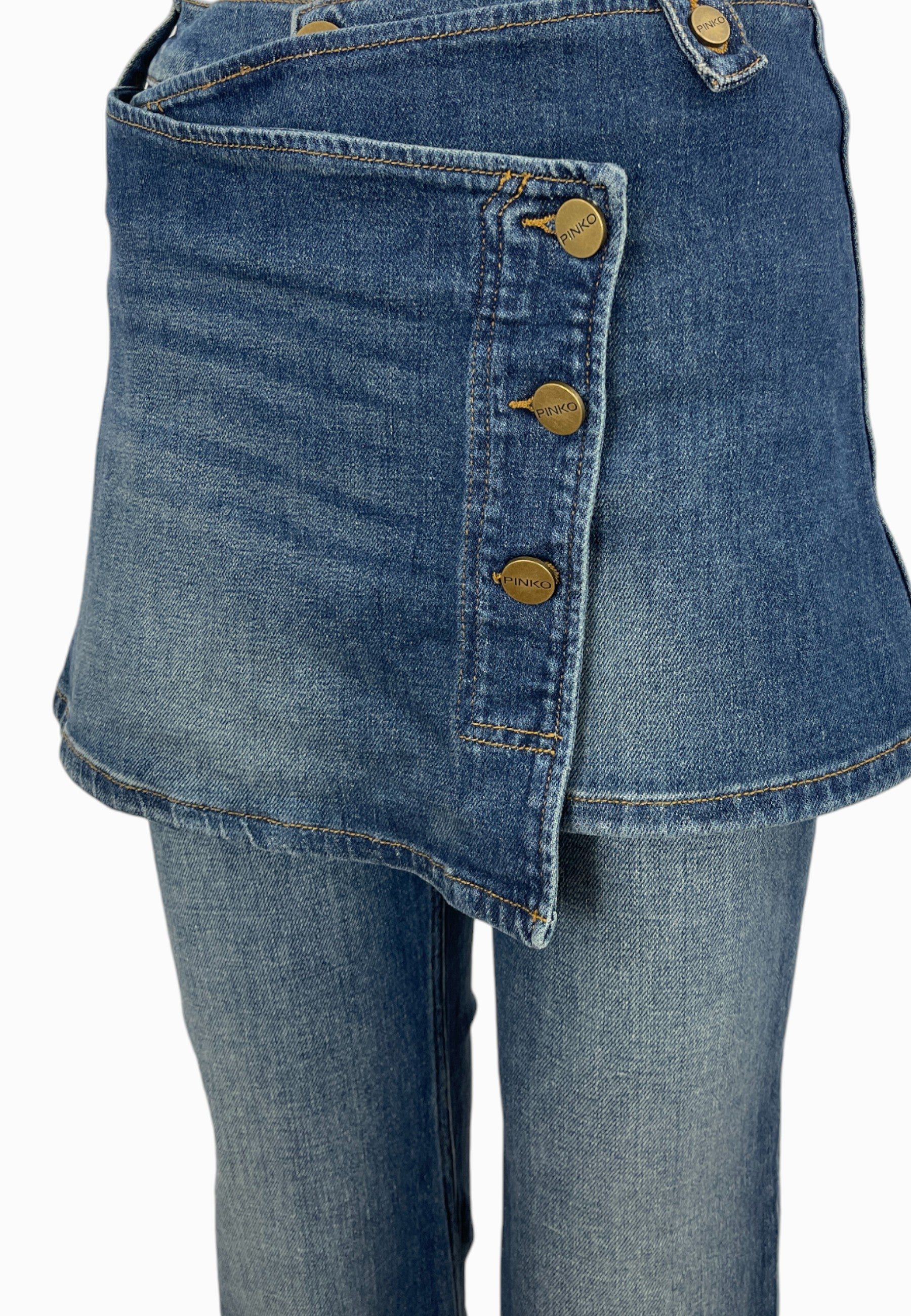 • JEANS CON GAMBA LEGGERMENTE SVASATA SUL FONDO E MINIGONNA STACCABILE SULLA PARTE SUPERIORE