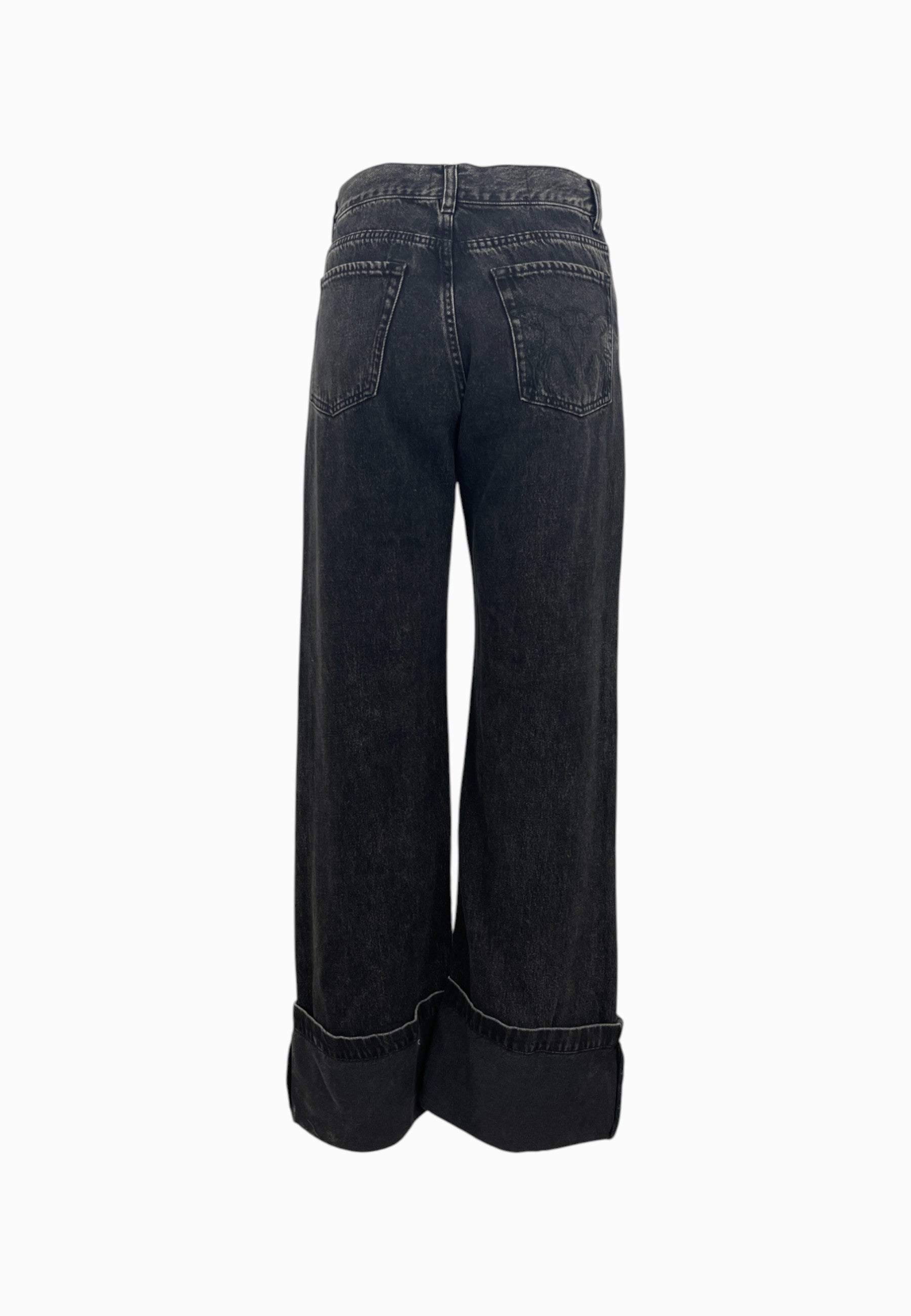 • JEANS SLAVATO,CINQUE TASCHE , GAMBA MORBIDA CON RISVOLTO ALTO,LOGO DECORATIVO SULLA CINTURA