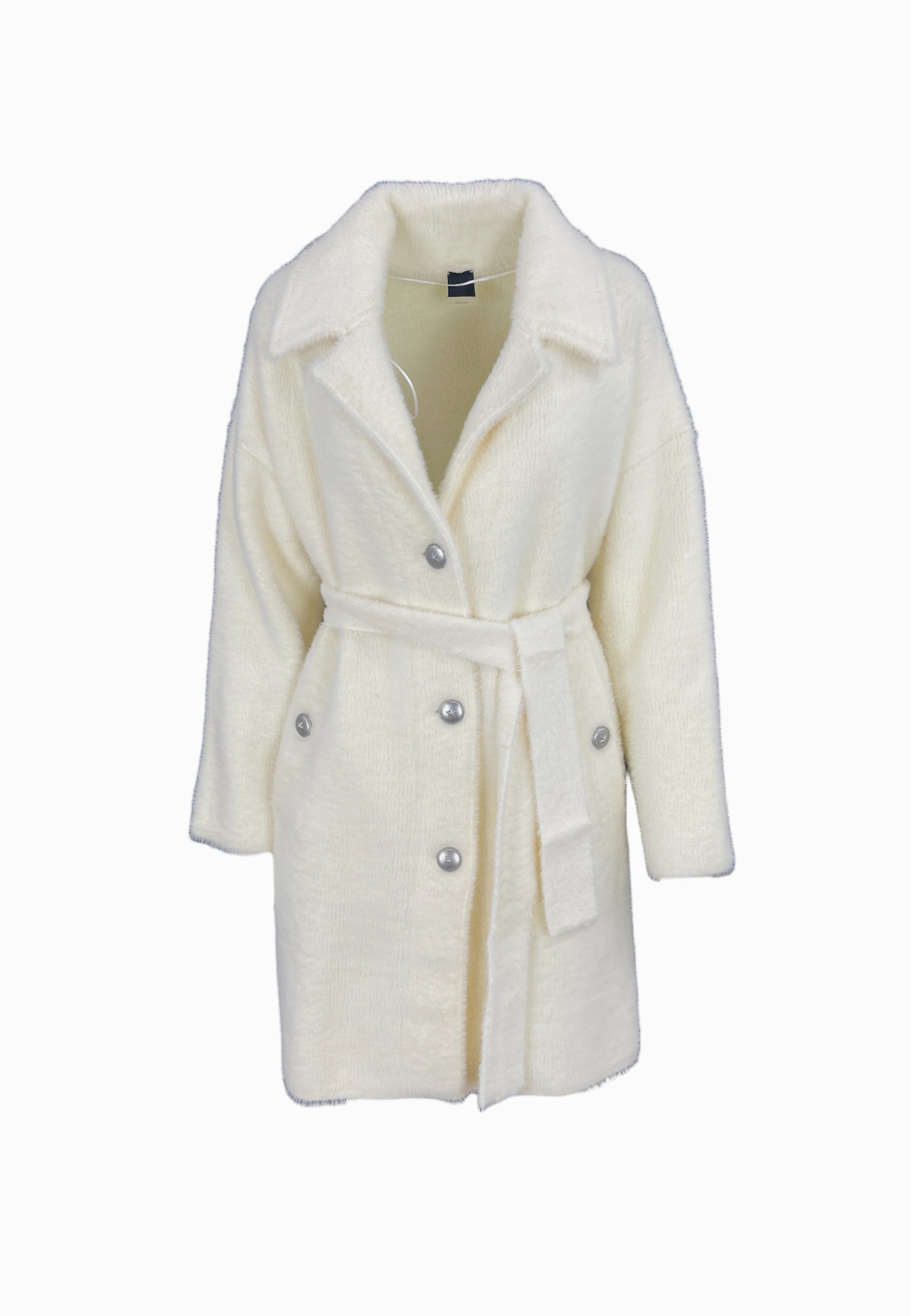 • CAPPOTTO MONOPETTO CON CINTURA,CHIUSURA TRE BOTTONI COLORE ARGENTO CON DISEGNO STELLA ,TESSUTO EFFETTO PELO,DUE TASCHE