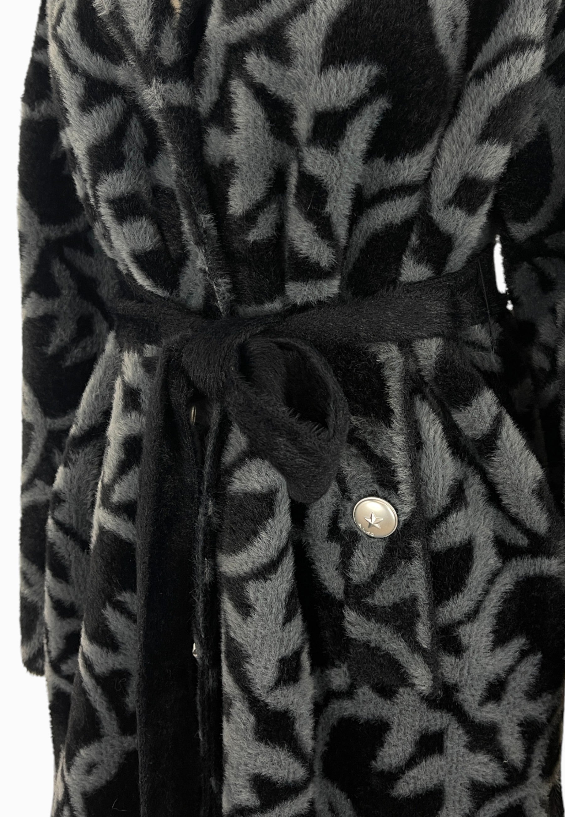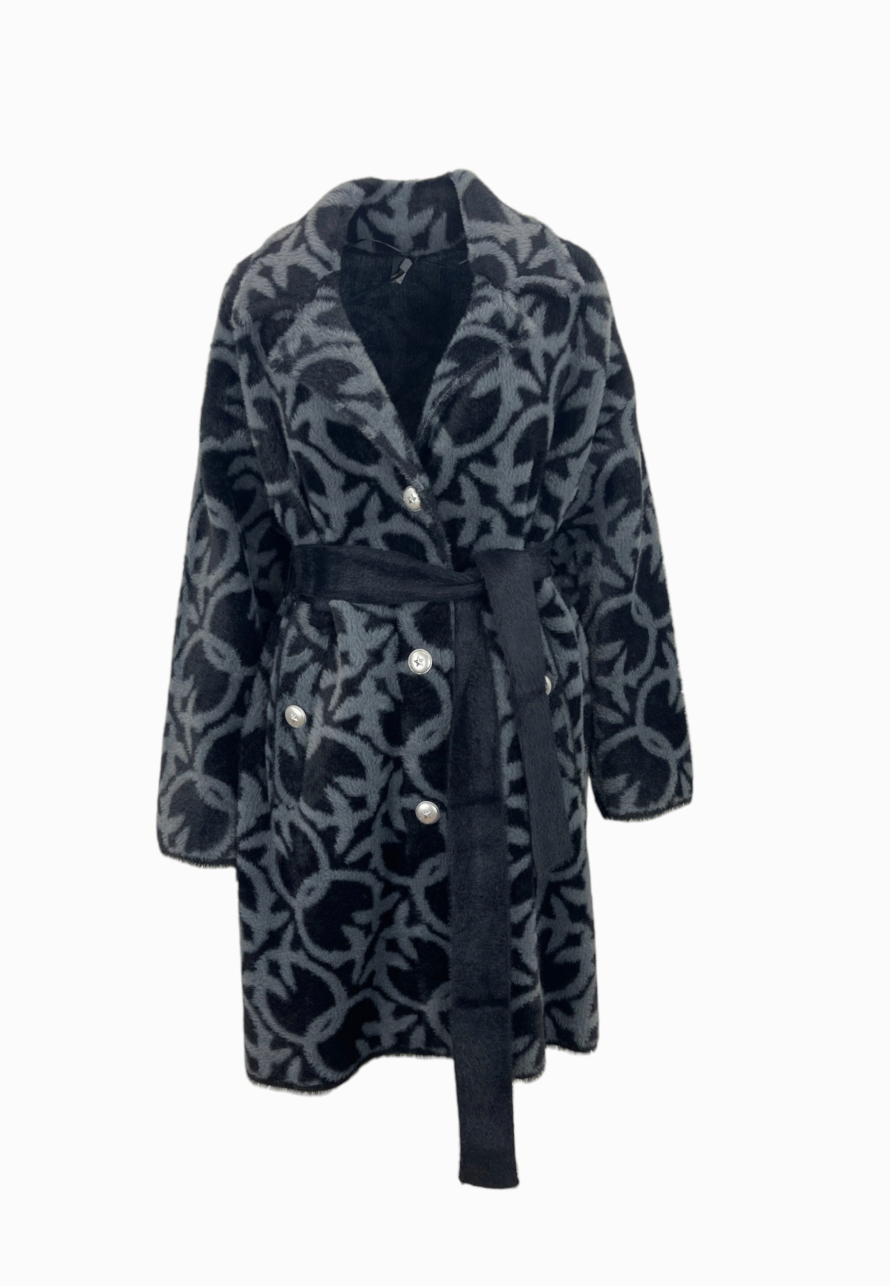 • CAPPOTTO MONOPETTO CON CINTURA,CHIUSURA TRE BOTTONI COLORE ARGENTO CON DISEGNO STELLA ,TESSUTO EFFETTO PELO LOGATO,DUE TASCHE
