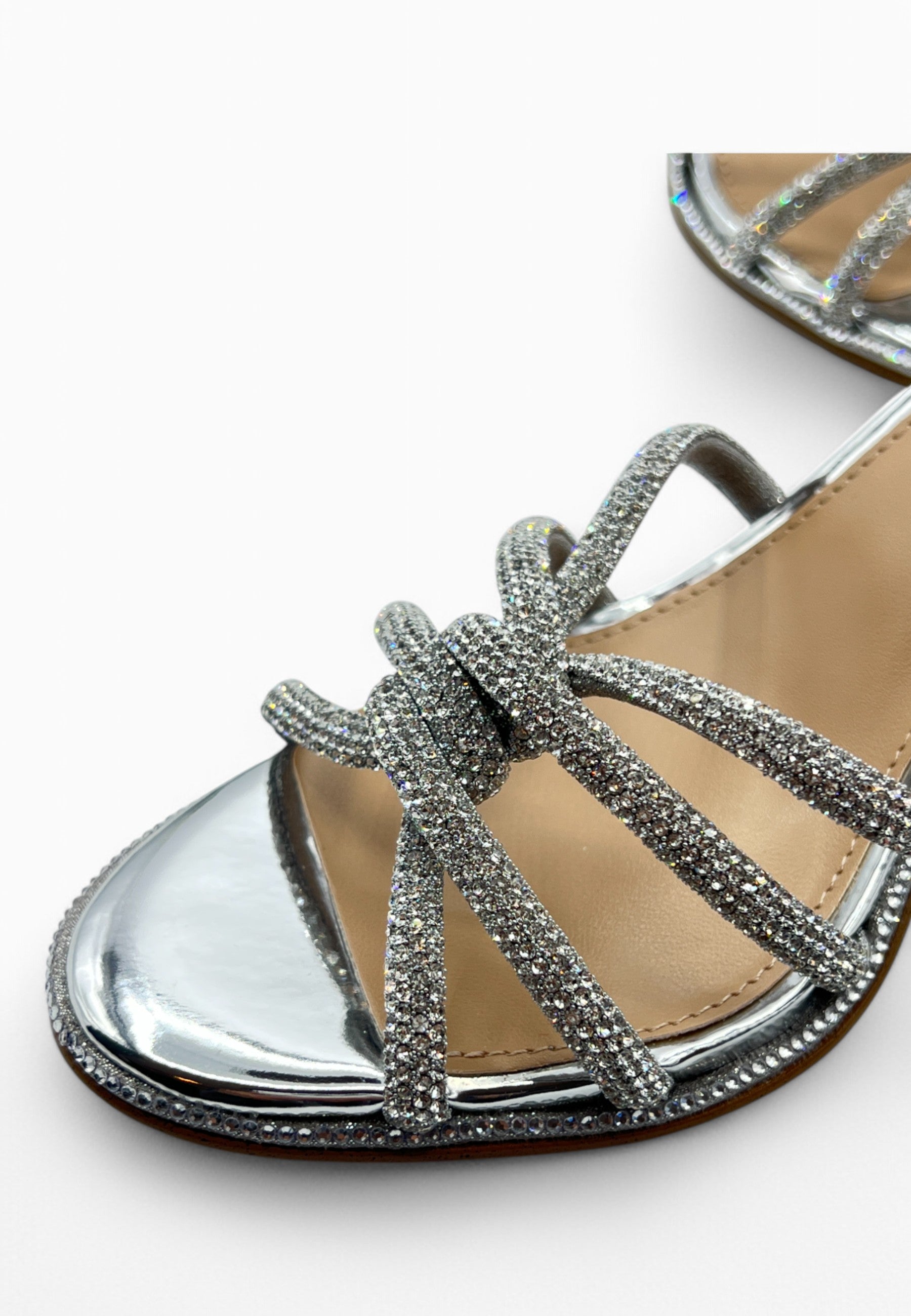 • SANDALO CON TACCO, LIISTINI INTRECCIATI FULL GLITTER, ALLACCIATURA ALLA CAVIGLIA CON PENDENTE LOGATO